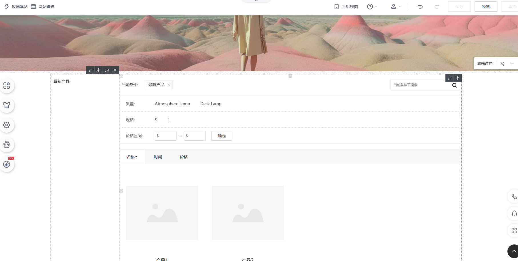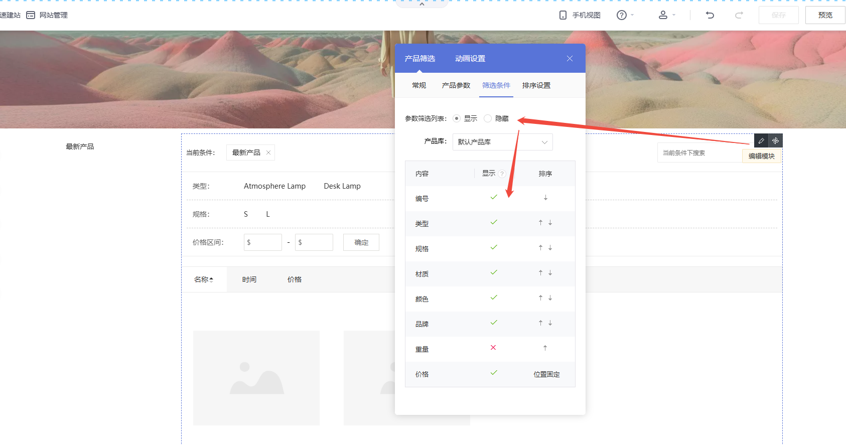 编辑产品筛选模块,即可设置筛选条件