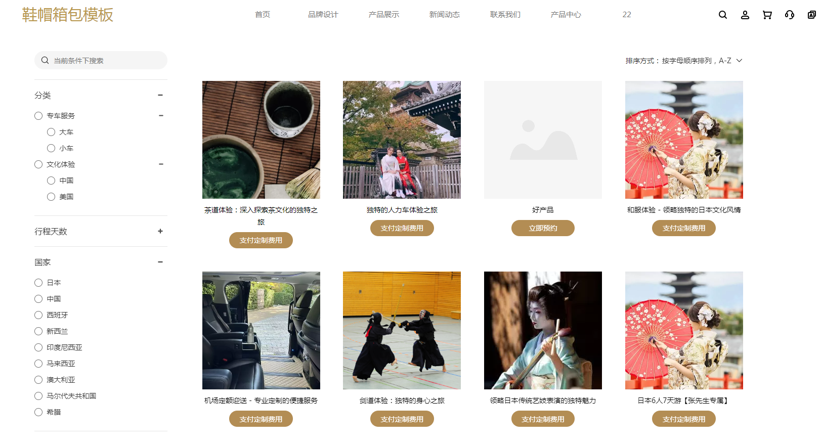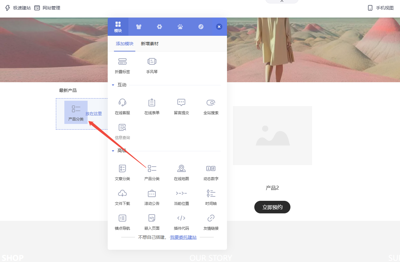 在页面添加产品分类模块后点击分类即可打开筛选页面