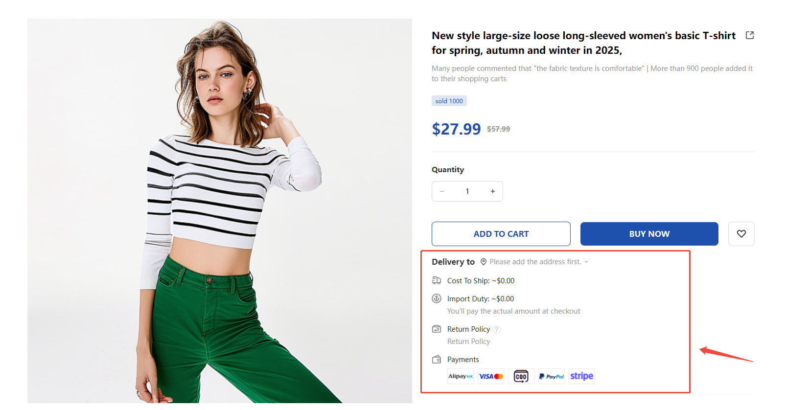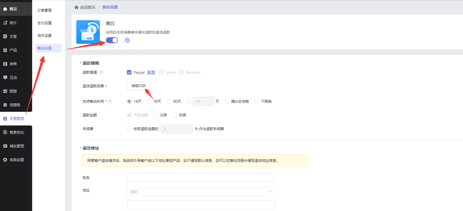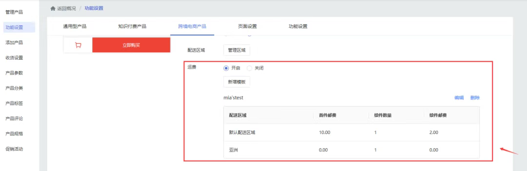 ps:系统默认展示【运费、税费、退换政策、支付方式】,开启相关功能可联动: