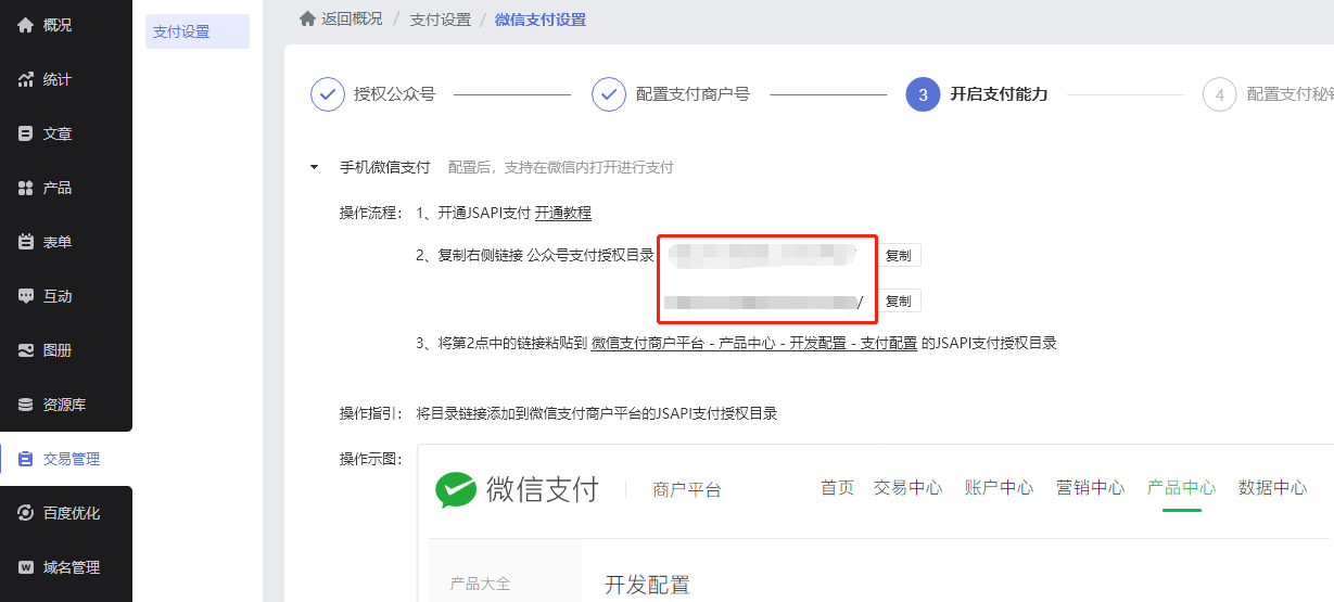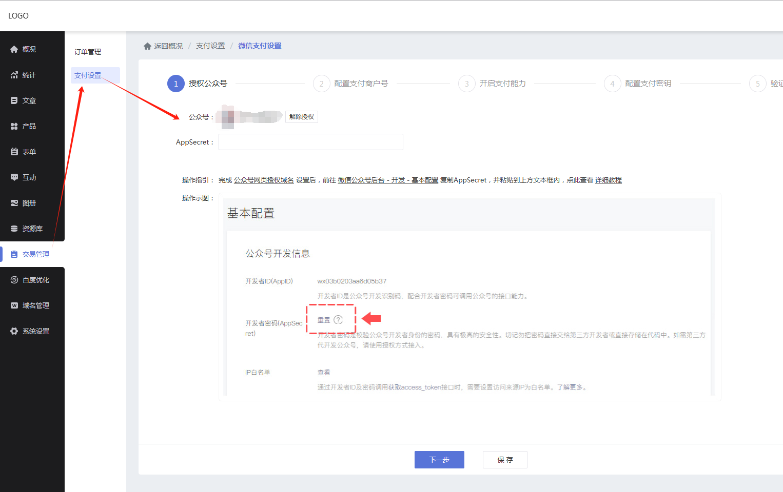 进入【管理后台-互动-公众号】中,将已开通微信支付功能的公众号,授权到管理后台,并在微信开发者平台-公众号中获取appsecret并填写。
