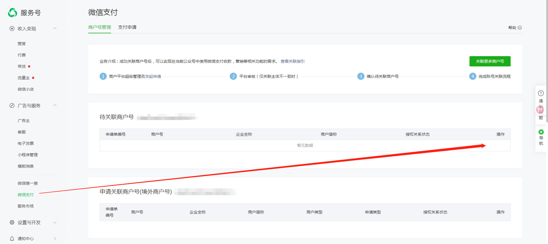 提交授权申请后,返回【微信公众号后台-广告与服务-微信支付-商户号管理-待关联商户号】中进行确认。