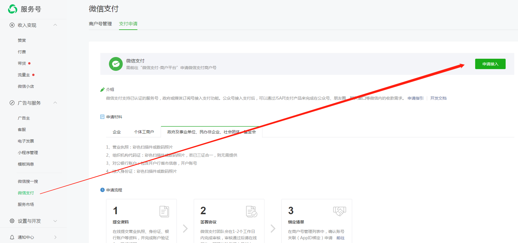 如果未拥有微信支付商户号,可登录“已认证服务号”或“已认证公众号(仅支持政府和媒体类型)”,进入【微信公众号后台-广告与服务-微信支付-支付申请】中,点击“申请接入”。