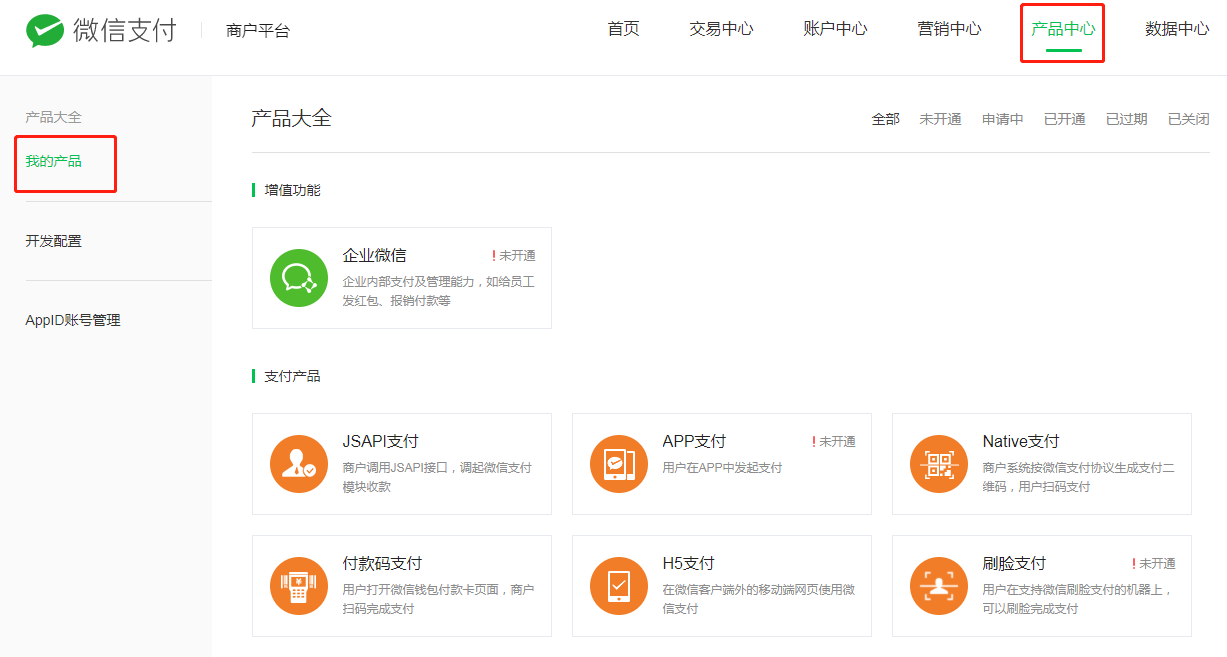 进入到微信支付商户平台-产品中心-产品大全-我的产品」中开通“Native支付”。