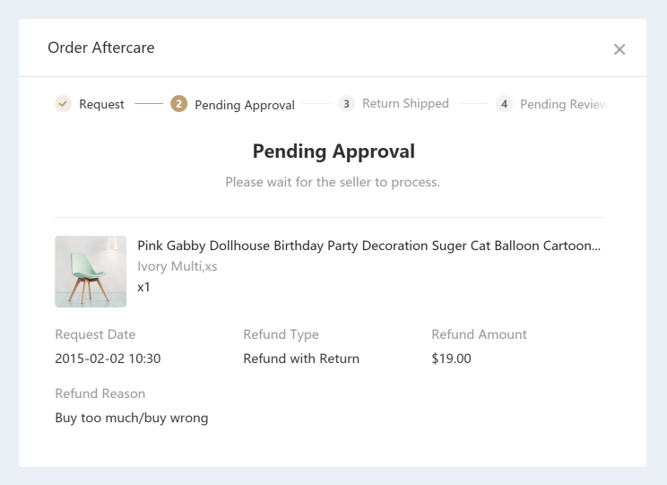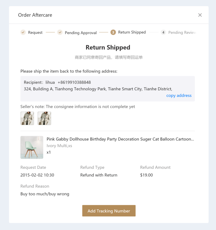 点击“Request Return”,在弹窗中可以选择售后类型“Refund with Return(退货退款)”或者“Refund Only(仅退款)”: