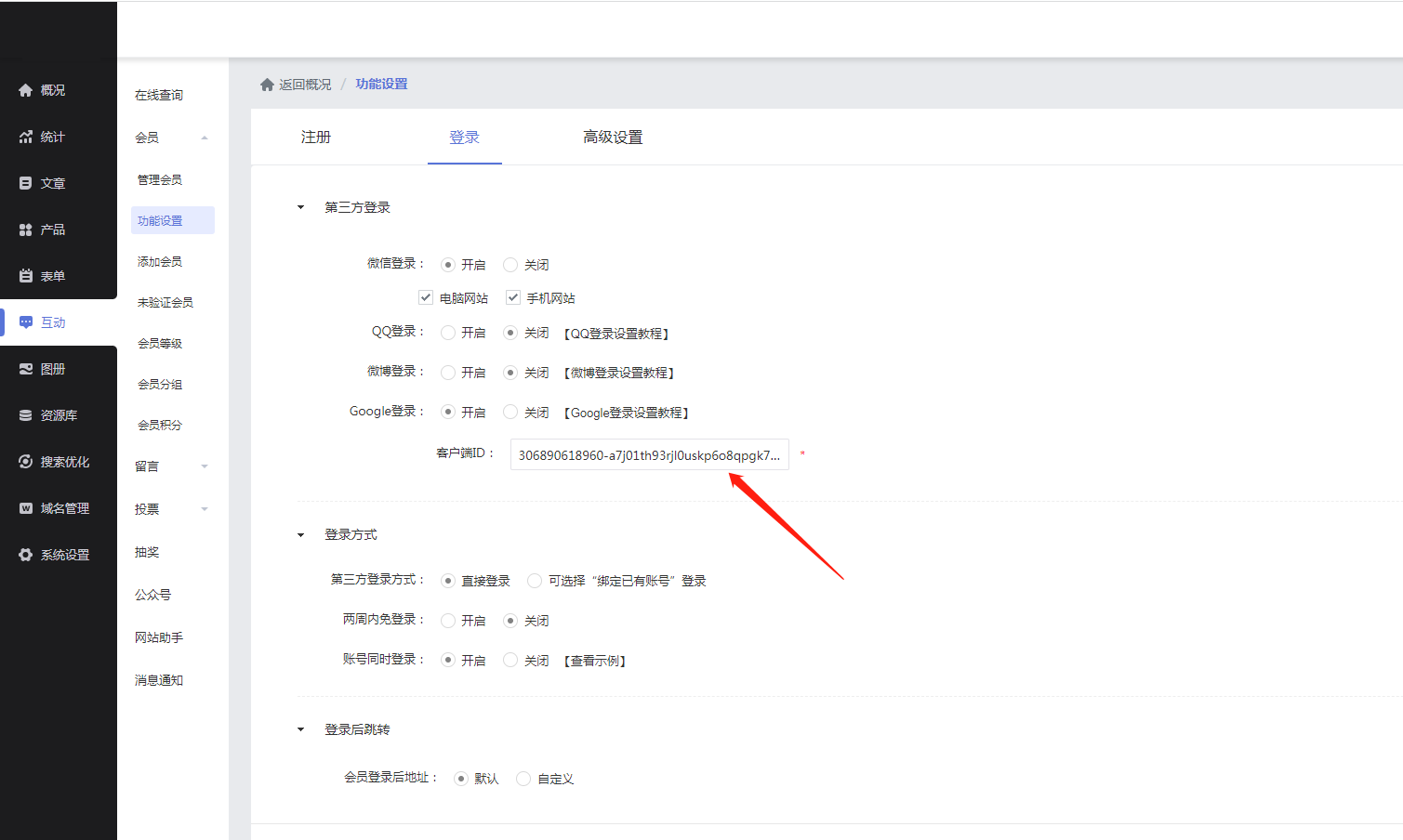 网站会员登录设置对接谷歌,在网站首页显示登录入口,访客可以通过谷歌账号授权进行登录网站成为会员。减少繁琐的会员注册步骤,留存会员。
