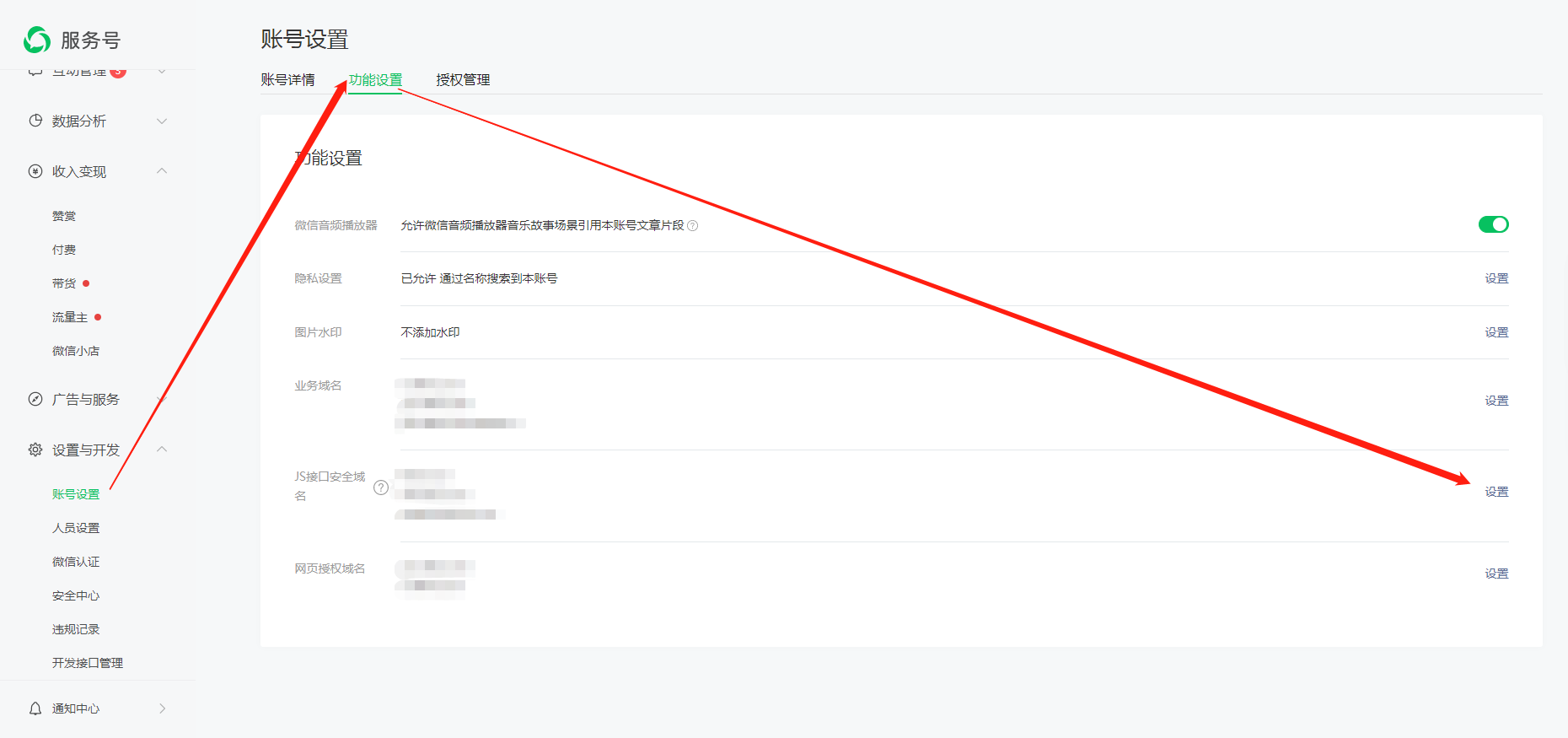 1.1 登录您授权的公众号管理后台(https://mp.weixin.qq.com/),在左侧导航【设置与开发-账号设置】中点击【功能设置】进入设置JS接口安全域名。