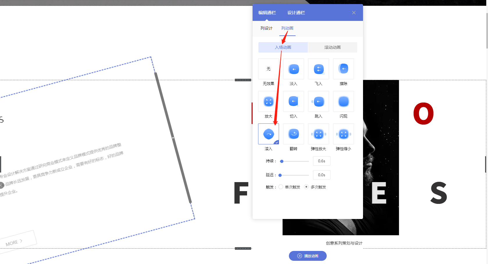 2. 点击“列动画”,再选用“入场动画”