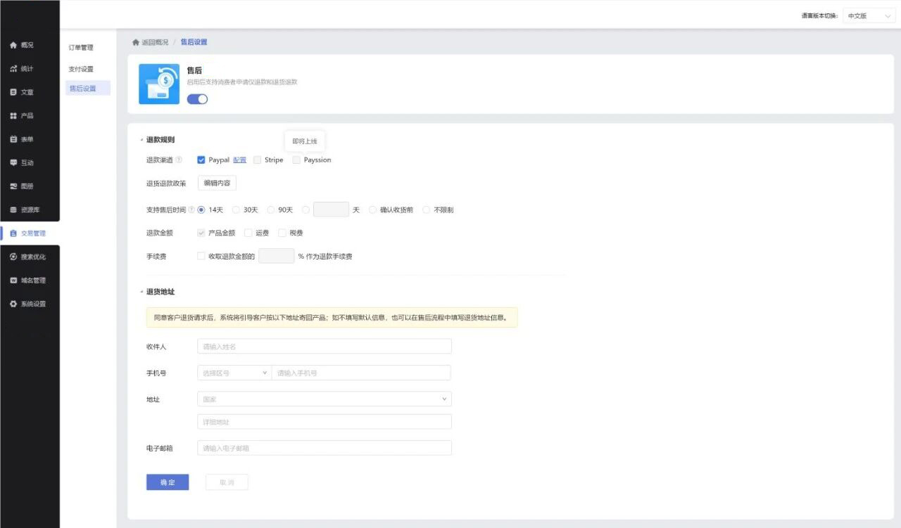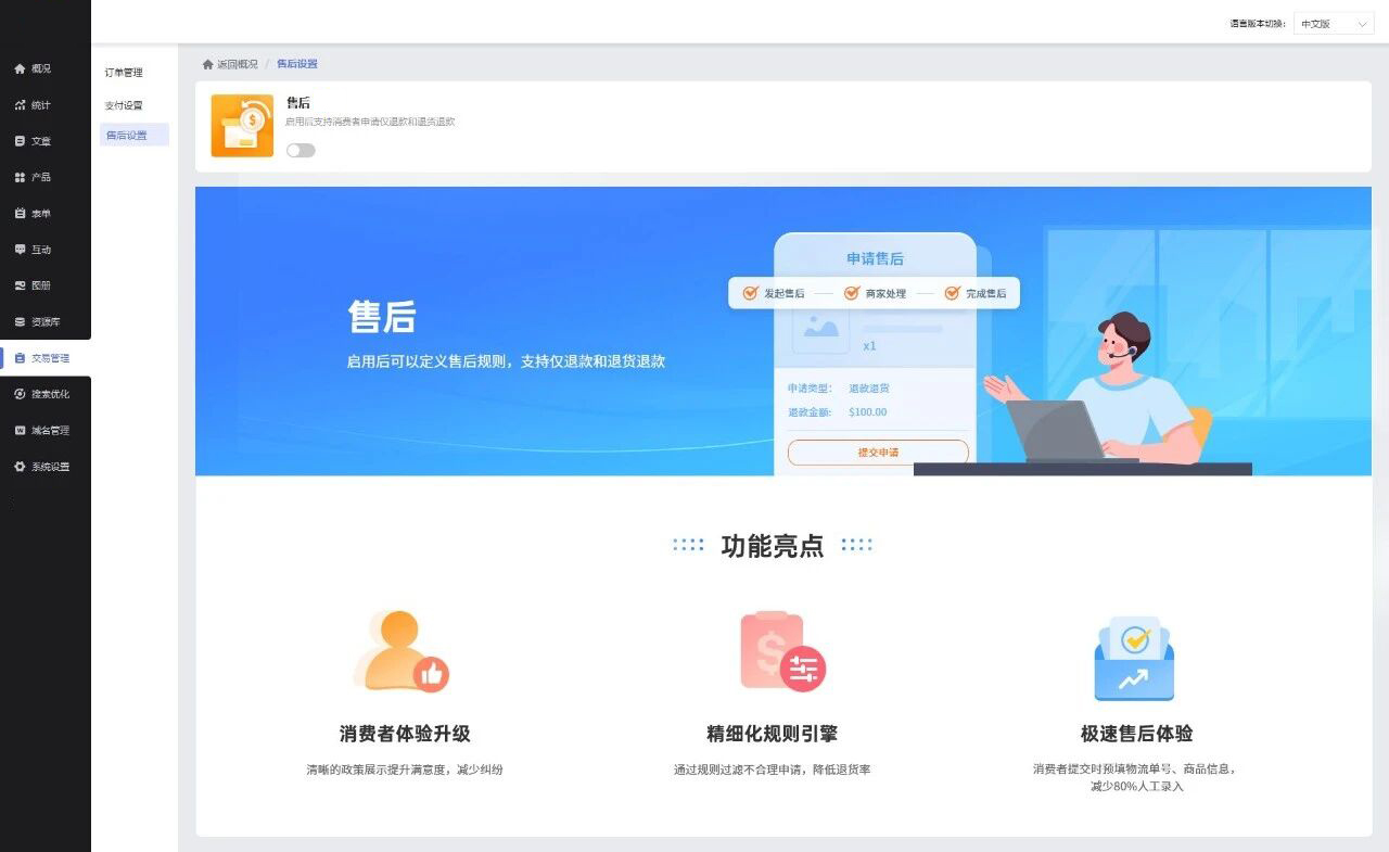 在管理后台-交易管理-售后设置中点击开启售后功能,支持自定义售后有效期、退款范围、以及手续费等逻辑。