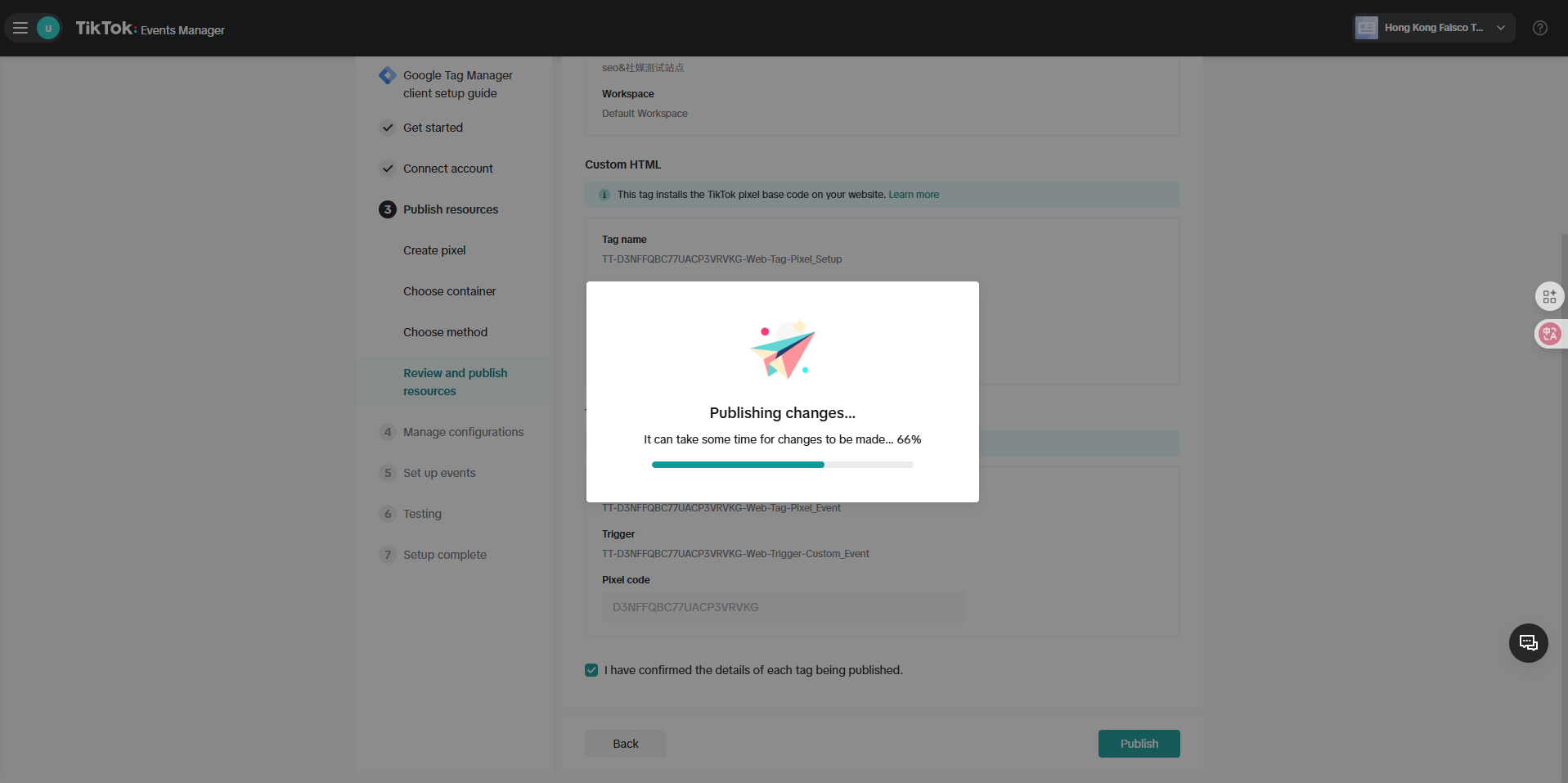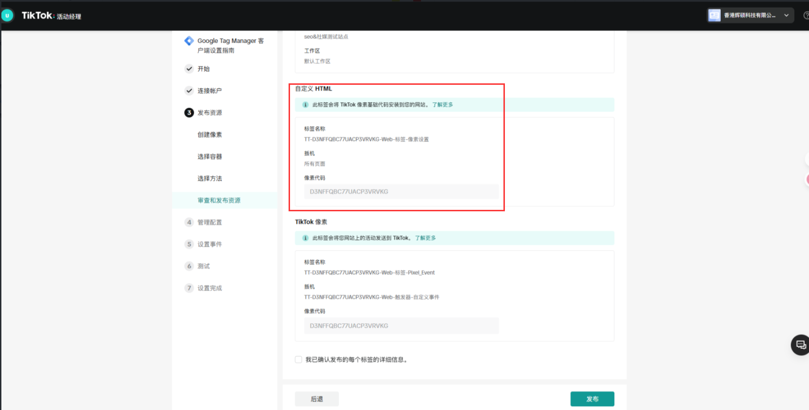 (如此步骤提示发布异常,可能是您gtm代码配置异常,请您登录GTM后台确定是否能正常发布版本)