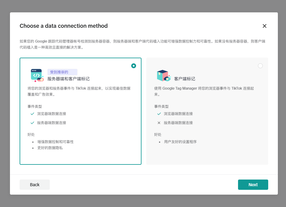 选择“Use Google Tag Manager data layer APIs”,TikTok会在后续步骤中往gtm插入像素代码,我们可以自己定义事件推送规则。