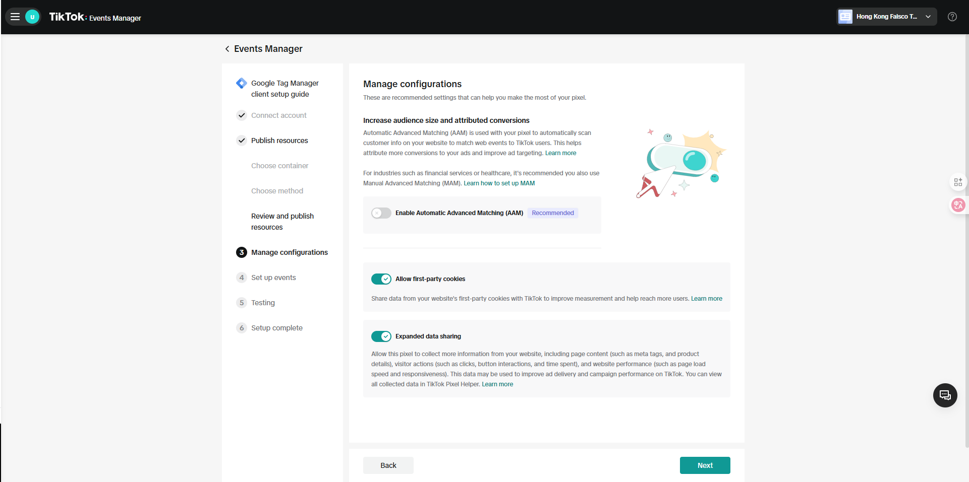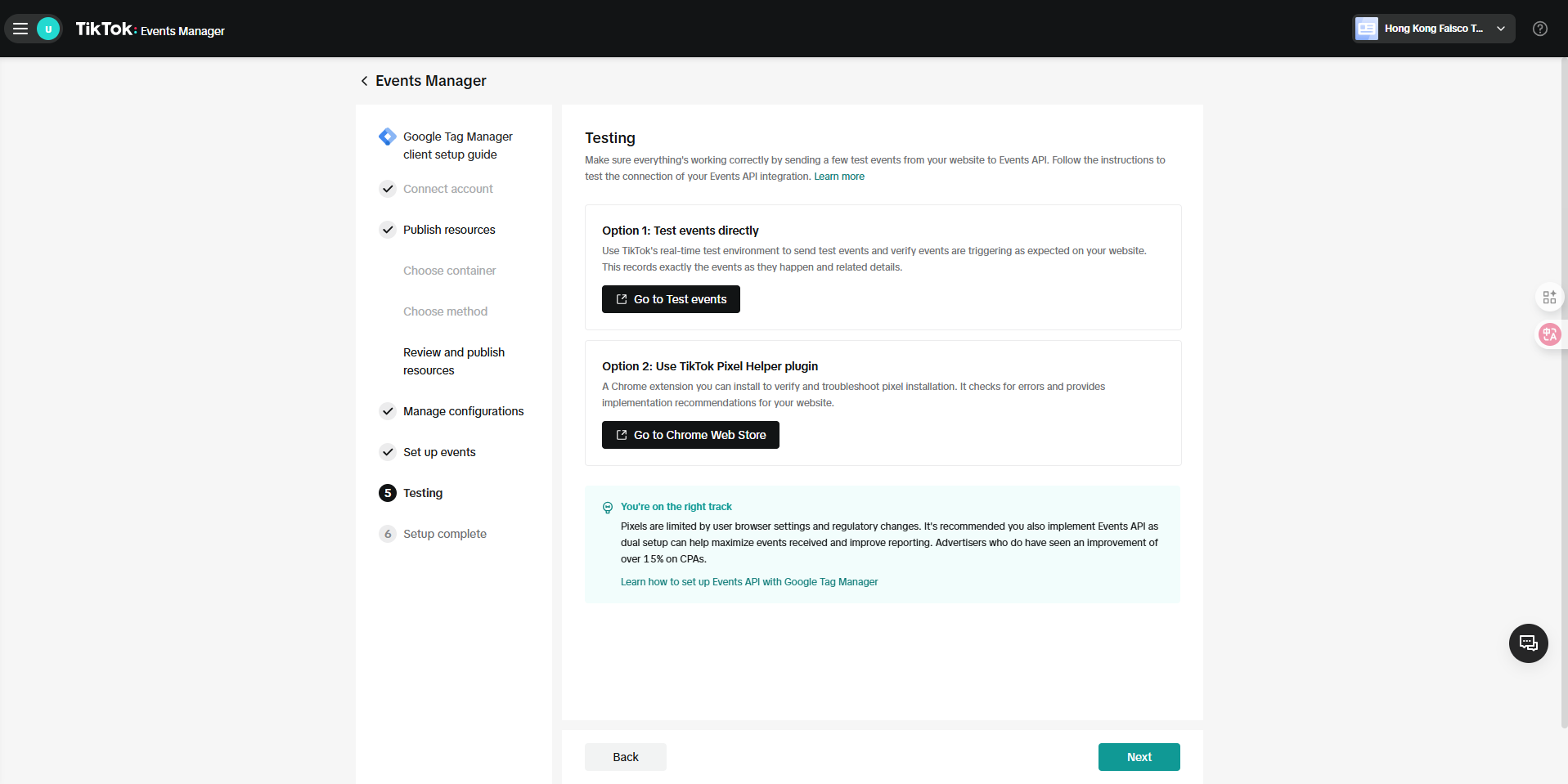 选择“Set up with Event builder”,TikTok会在后续步骤中往gtm插入像素代码和一个全部事件监听。