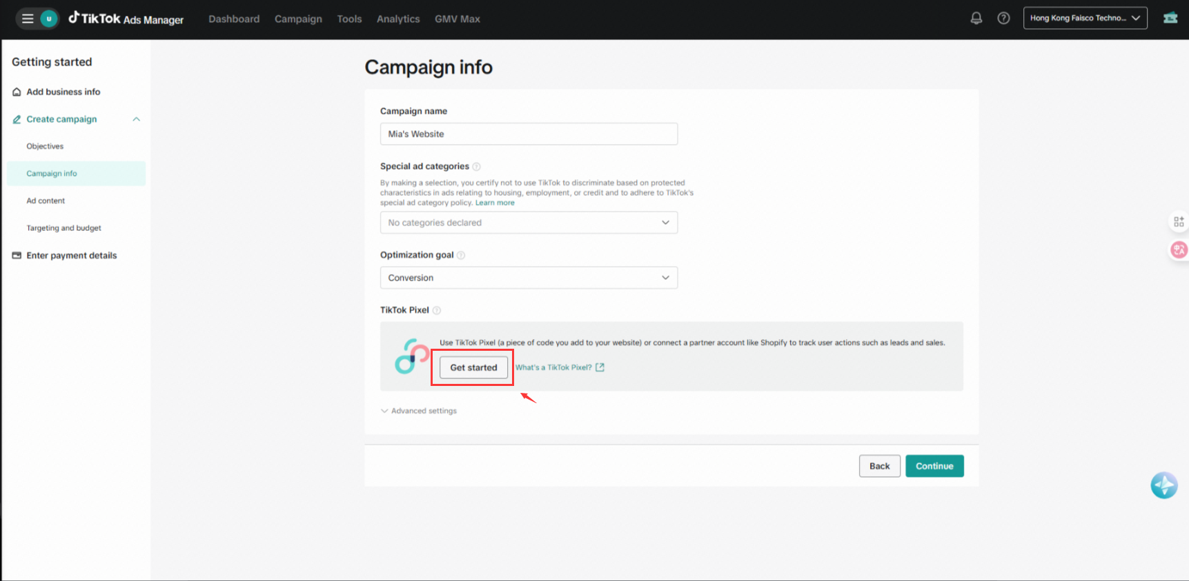 在此步骤中,先点击Tik Tokpixel的GetStarted按钮: