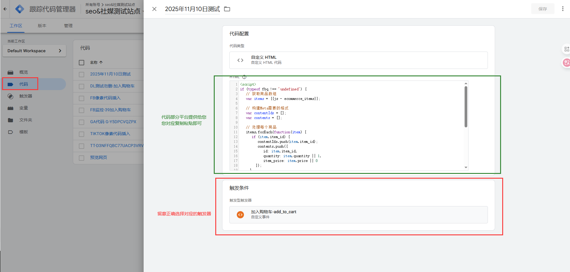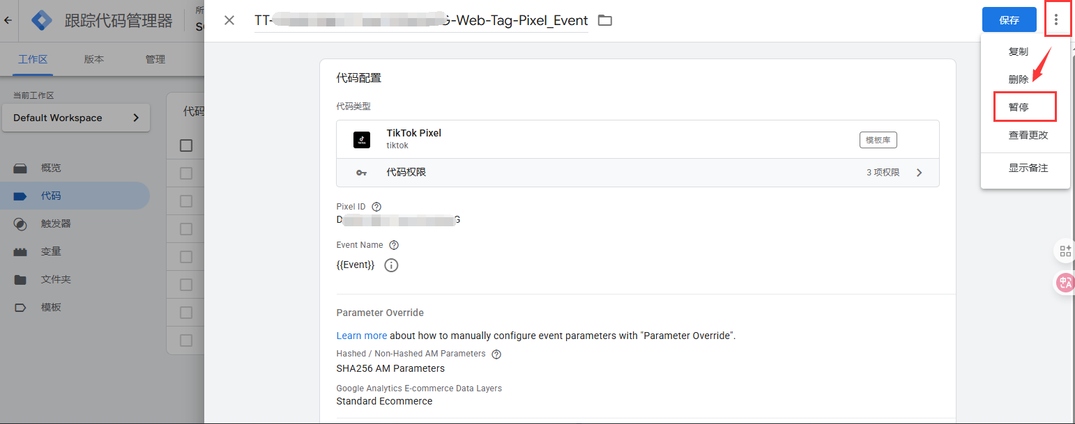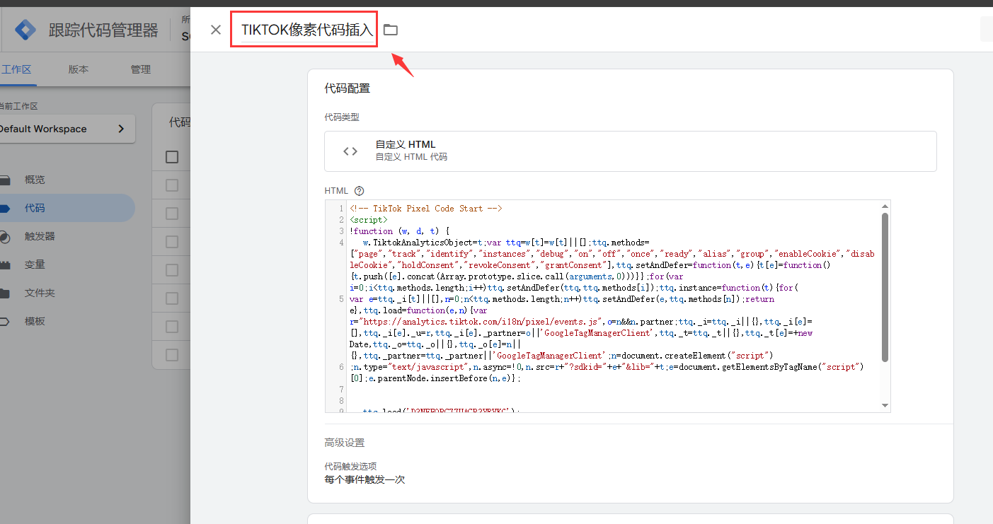 您可以进入这个代码详情更改它的名称,因为案例的GTM账号同时处理了多个社媒平台,为了更好的区分代码,我将这个代码命名为“TIKTOK像素代码插入”,您可以根据您的喜好修改或保留原名称。