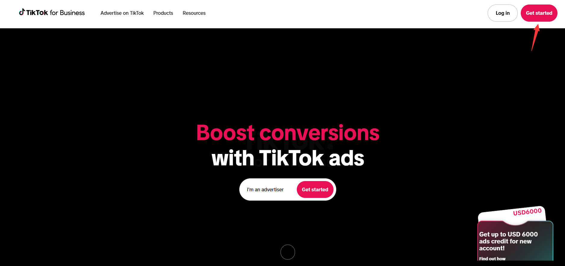 请访问https://ads.tiktok.com/business点��右上角“Get Started”,以广告主的身份创建账号(如您是首次创建,留意创建时“是否为代理”选择为no):