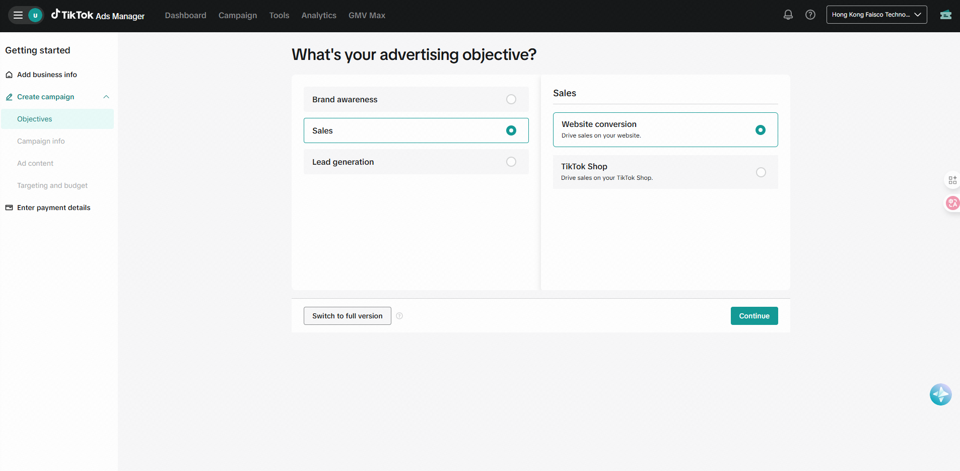 本博客以外贸零售场景为例,选择“sales - website conversion ”,如您的网站不应用于海外贸易,可以根据您的业务场景选择其他类型;