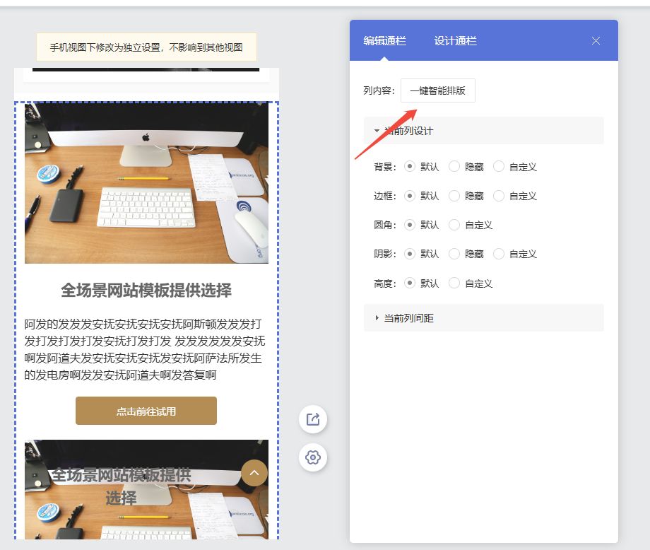 手机独立手动调整排版后再电脑视图添加模块,若期间手机视图出现乱版,可一键再智能排版:
