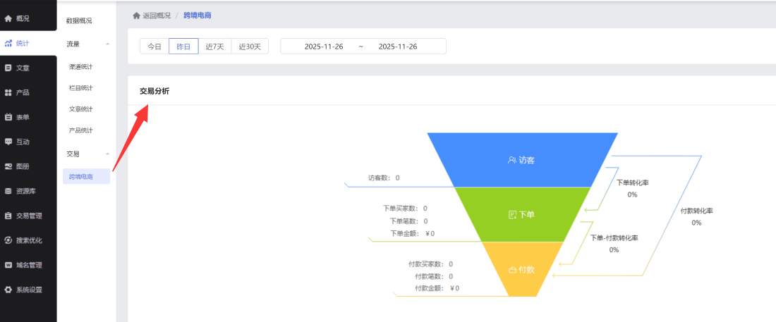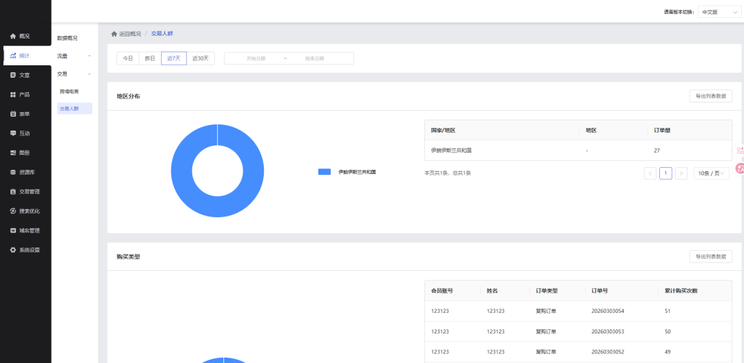 满足贸易商家的日常数据运营需求(需开启跨境电商功能后生效)。新增“产品分析”与“交易人群分析”维度的交易数据,助力商家更精准地掌握运营情况。