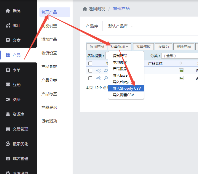 2、在后台产品管理中点击批量添加,点击“导入shopify CSV”