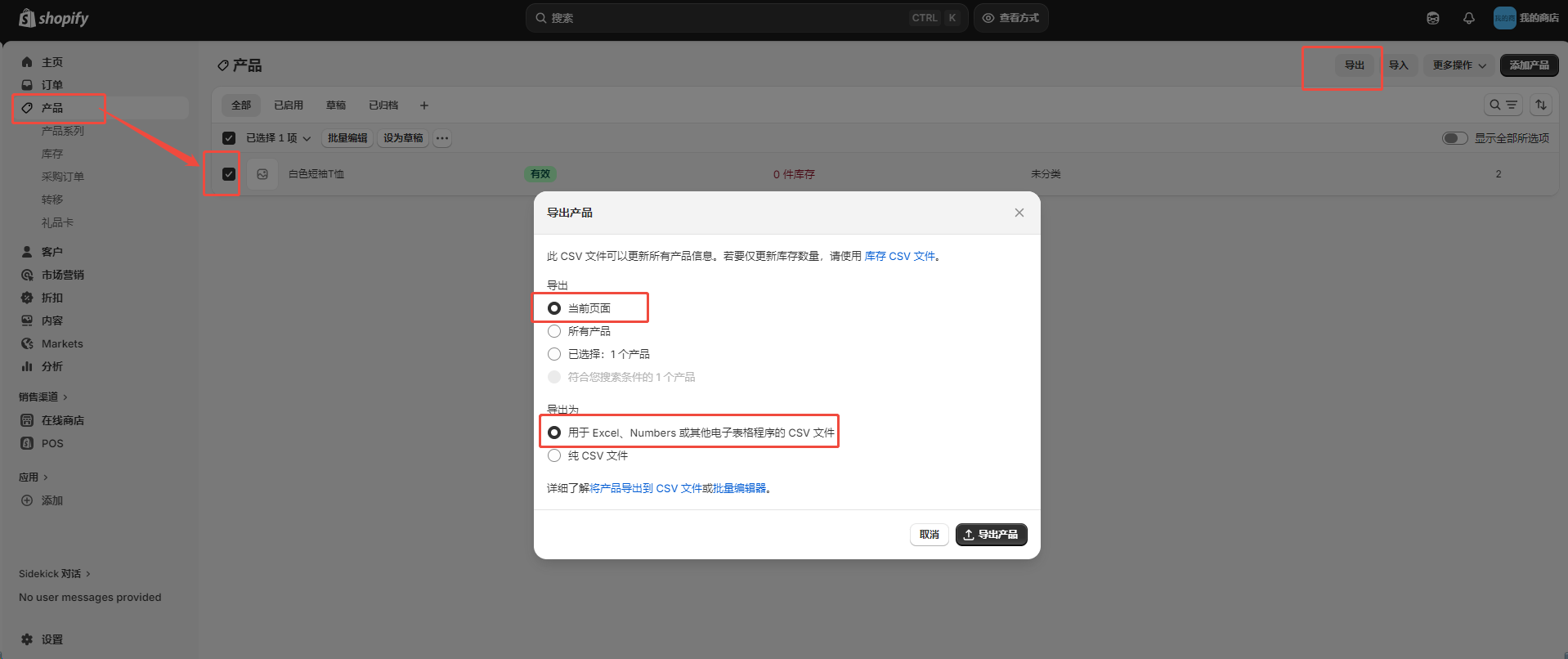 1、从产品列表点击导出,选择目标产品,选择适用于 Excel、Numbers 或其他试算表程式的 CSV ,系统会自动发送下载文件到您的注册邮箱