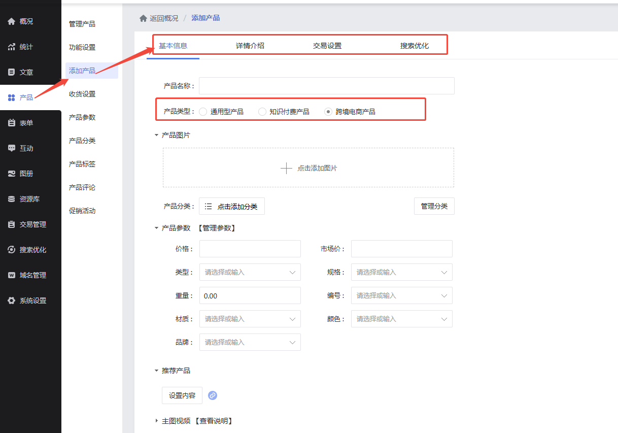添加跨境电商产品包括三部分的设置:①基本信息;②详情介绍;③交易设置;④搜索优化。一般基础的是产品名称、内容以及价格,请根据您的实际情况设置。