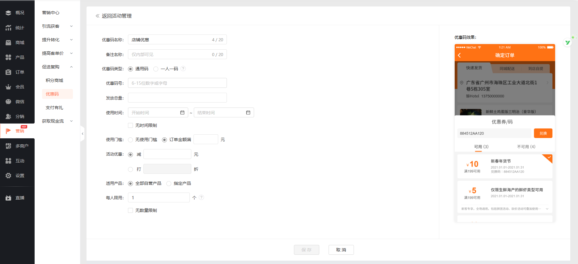 2. 创建优惠码活动