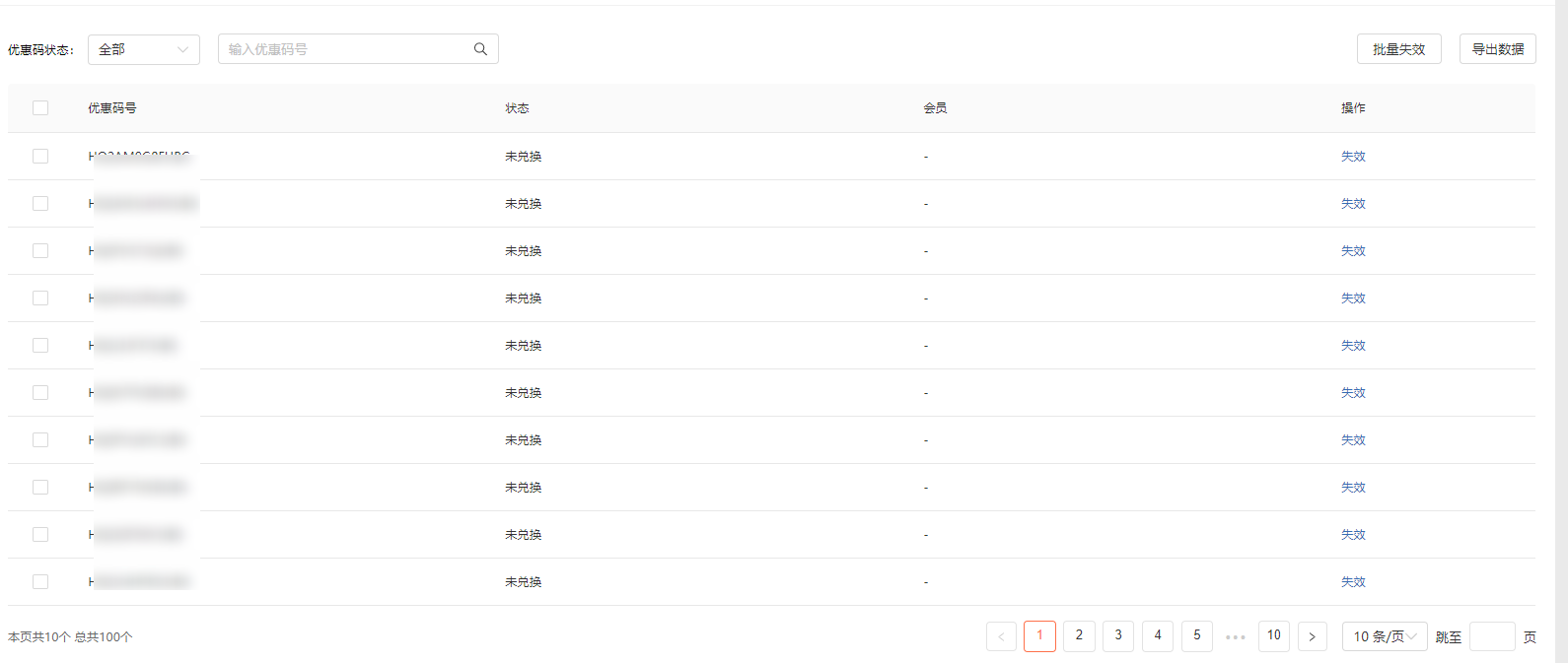 ② 批量失效:对选中的优惠码做失效处理,失效后不可再进行兑换