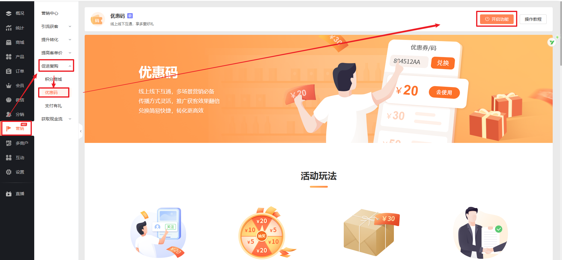 在商城管理后台【营销-促进复购-优惠码】中开启功能。