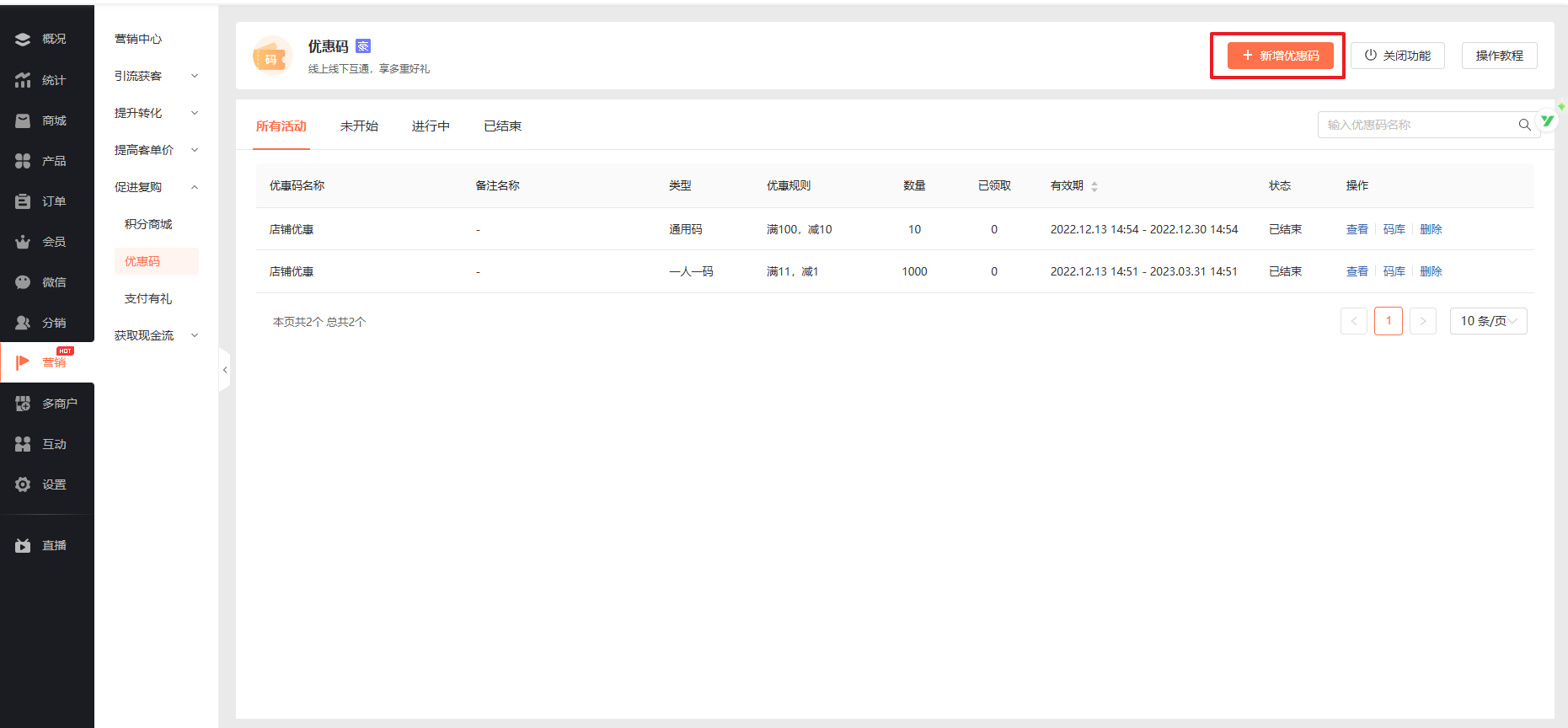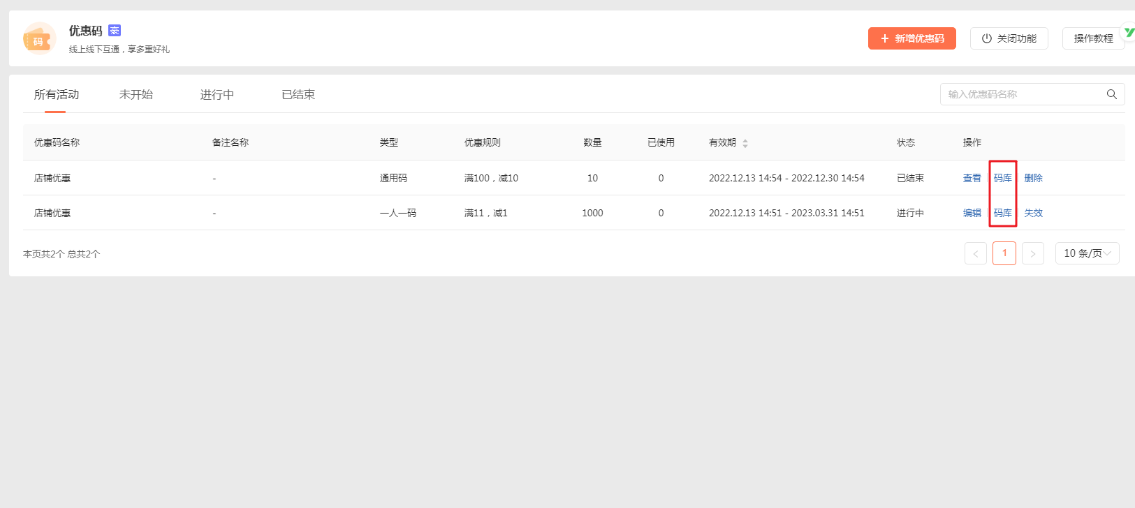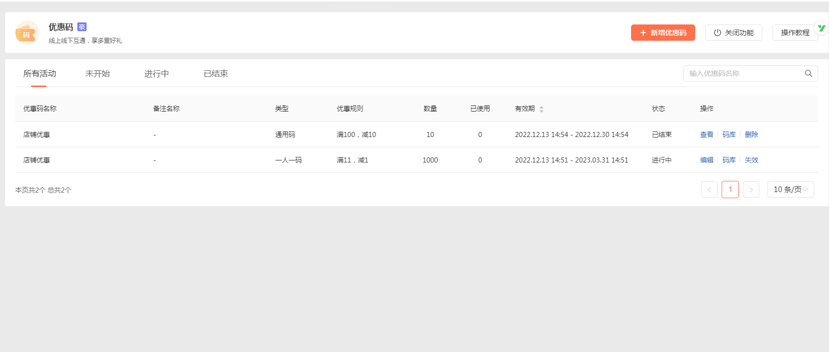 可对优惠码活动进行管理。