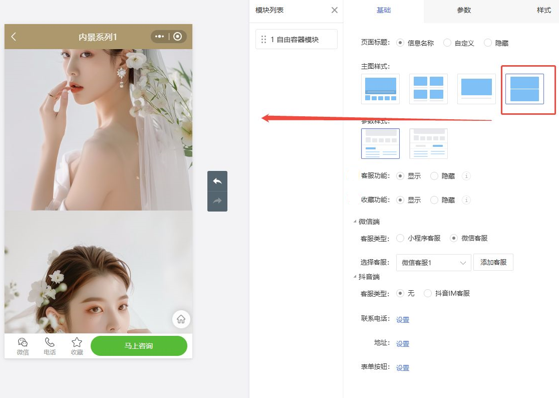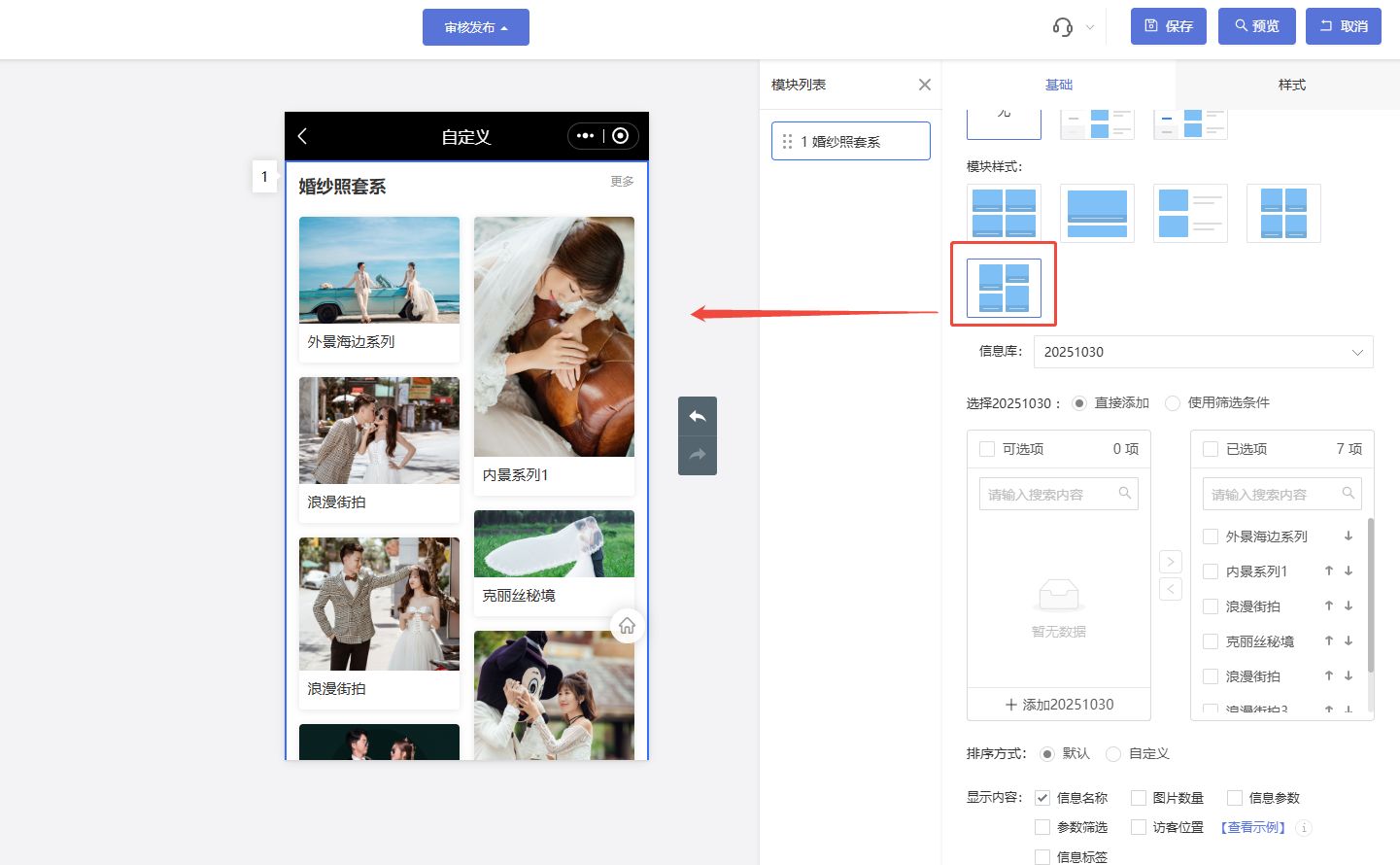 1、信息库模块新增样式:竖向两列排版、瀑布流样式如下,常见写真馆、婚纱摄影等样片客片展示使用: