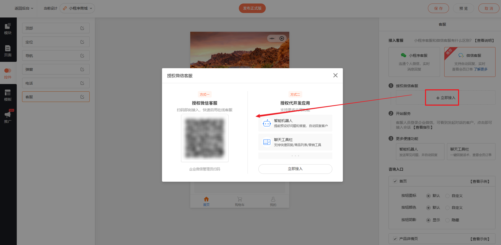 3.商城小程序设计页面,在客服控件中,移除已添加的客服