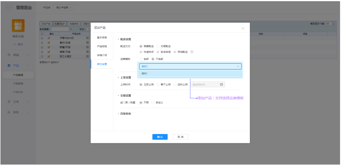 2. 模板创建完成,在添加商品时,可直接选择已创建的运费模板关联使用。