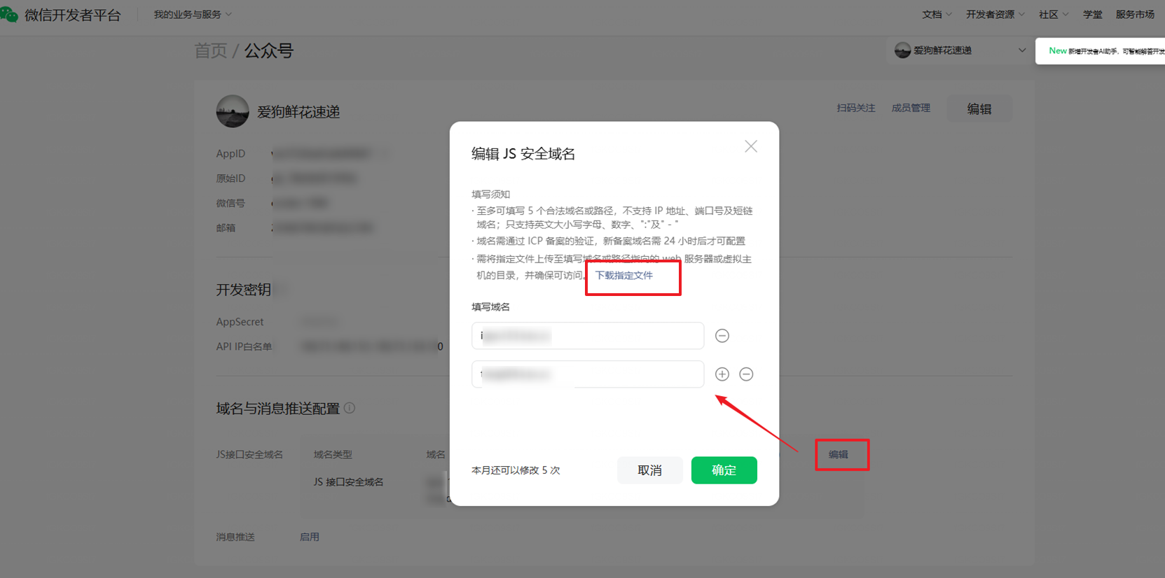 1.1 登录微信开放平台(https://developers.weixin.qq.com/platform)-我的业务-公众号/服务号-基础信息-开发密钥,进入设置JS接口安全域名。如图: