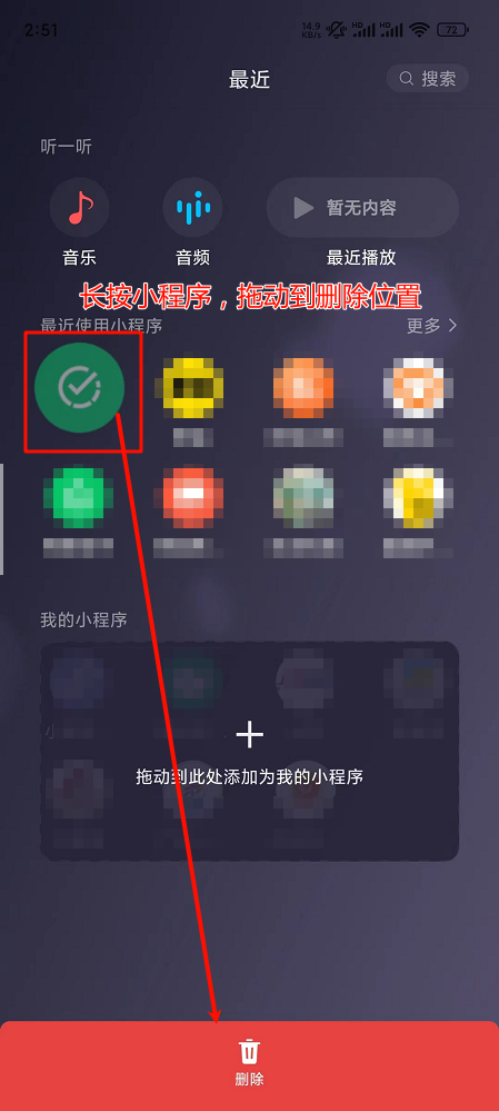 小程序:在微信中 删除该小程序(进入微信首页 → 下拉菜单 → 找到该小程序 → 长按拖动到删除位置删除),然后重新扫码或搜索进入。