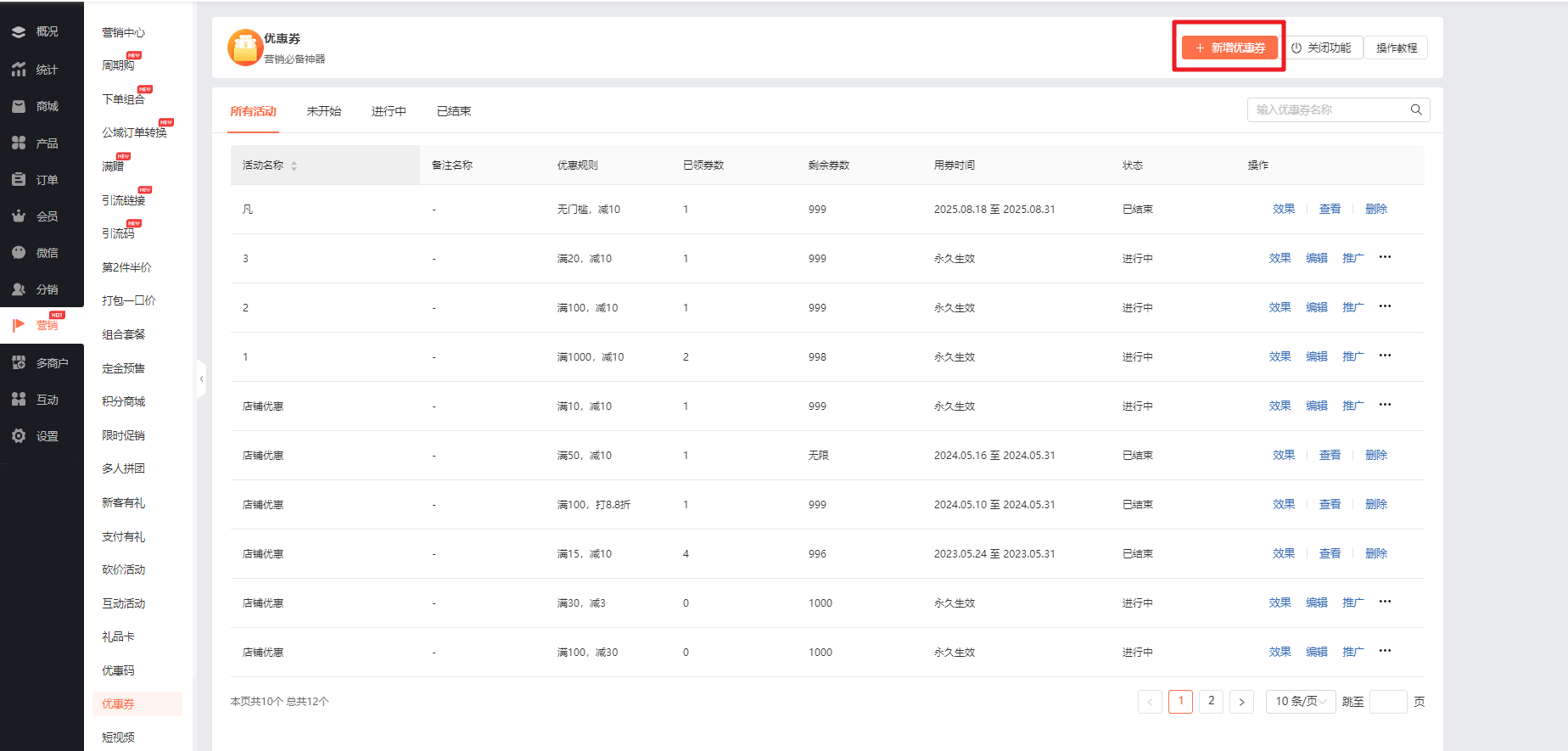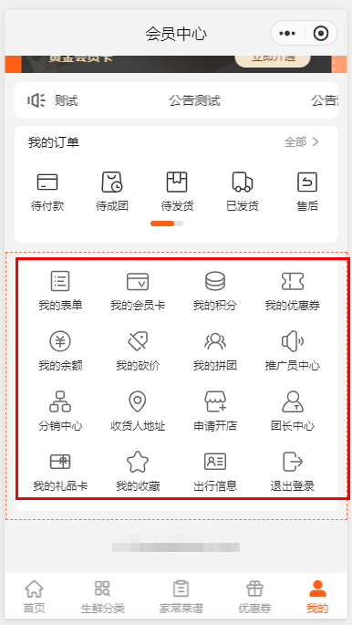 2.确认相关功能是否已启用 部分菜单(如【我的积分】、【优惠券】 等)依赖对应的功能模块,若该功能未开启,则菜单不会显示。 请检查后台“功能模块管理”,确保该菜单关 联的功能(如积分系统、优惠券系统等)已正常启用。