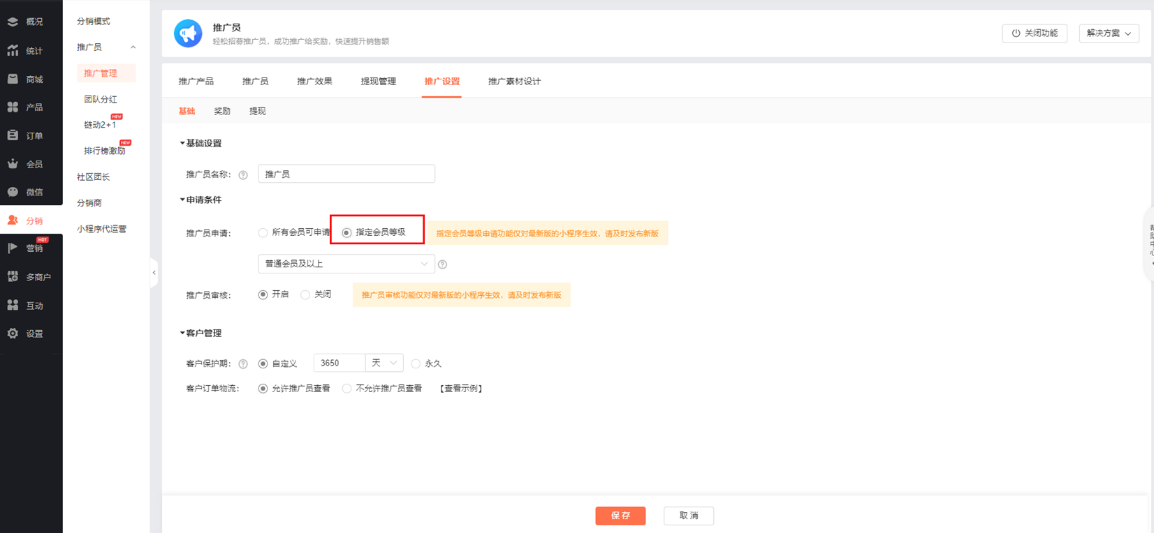 1.推广员审核功能入口:分销--推广员→推广设置页面开启