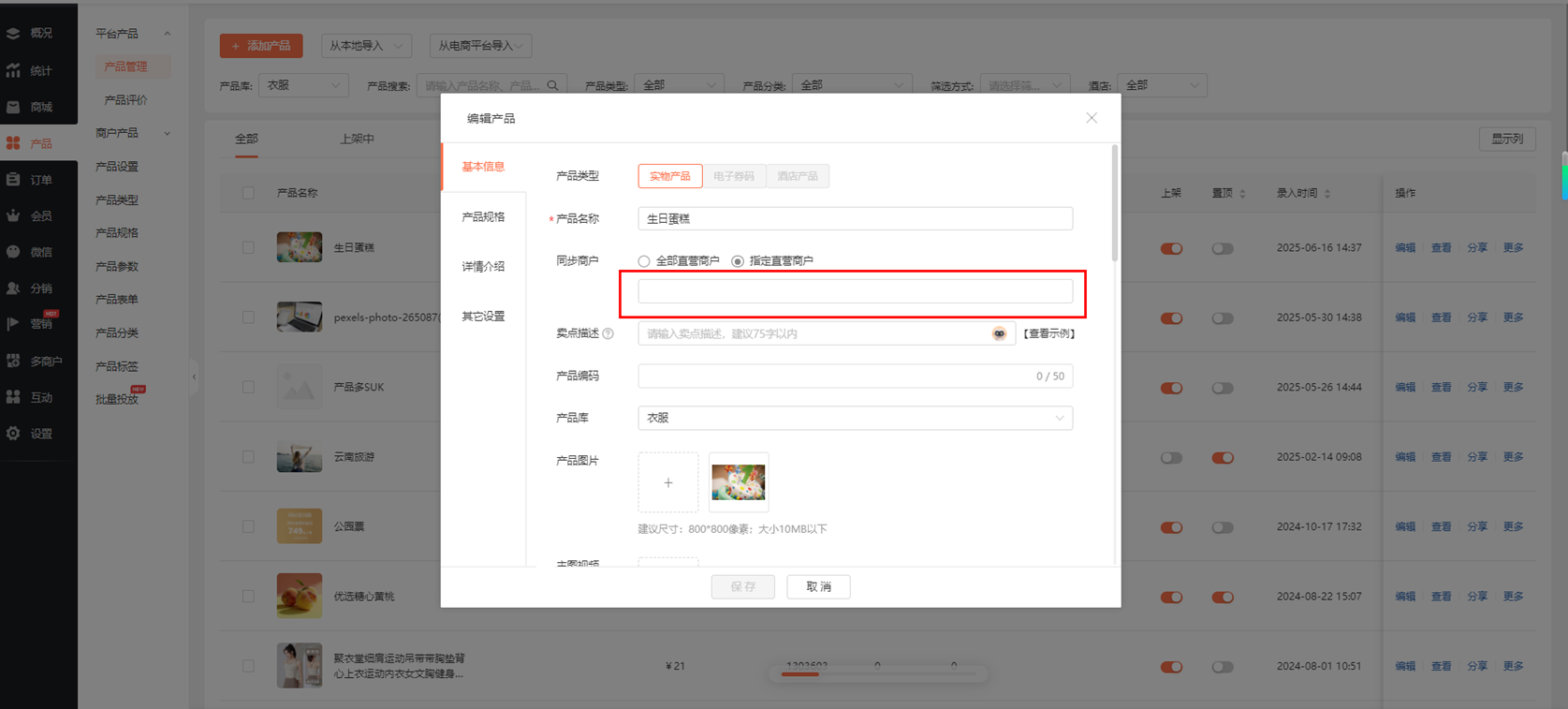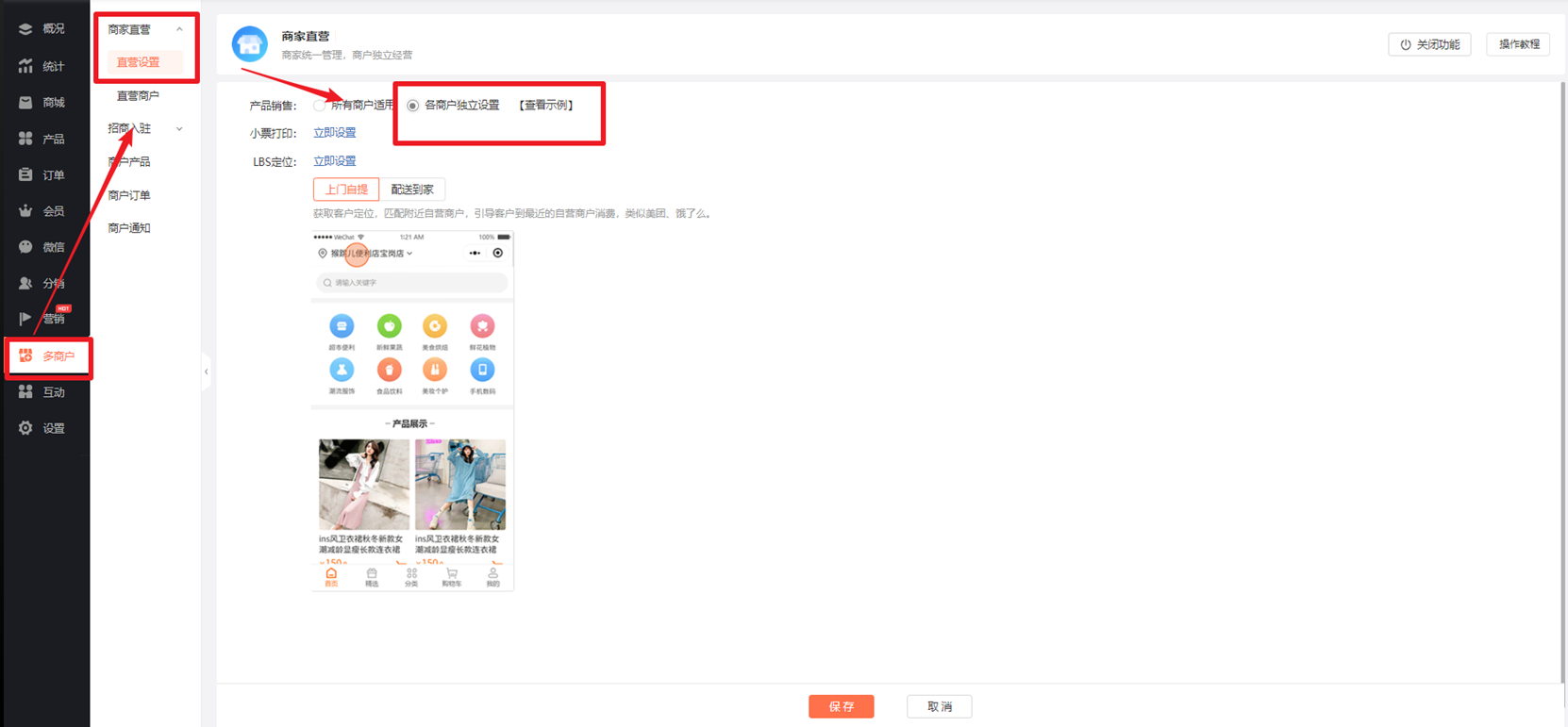 请在多商户--直营商户--直营设置中确认直营商户产品销售是否选择各商户独立设置
