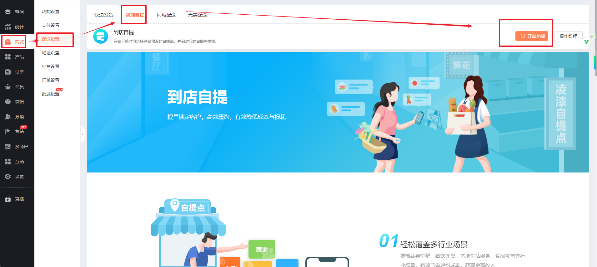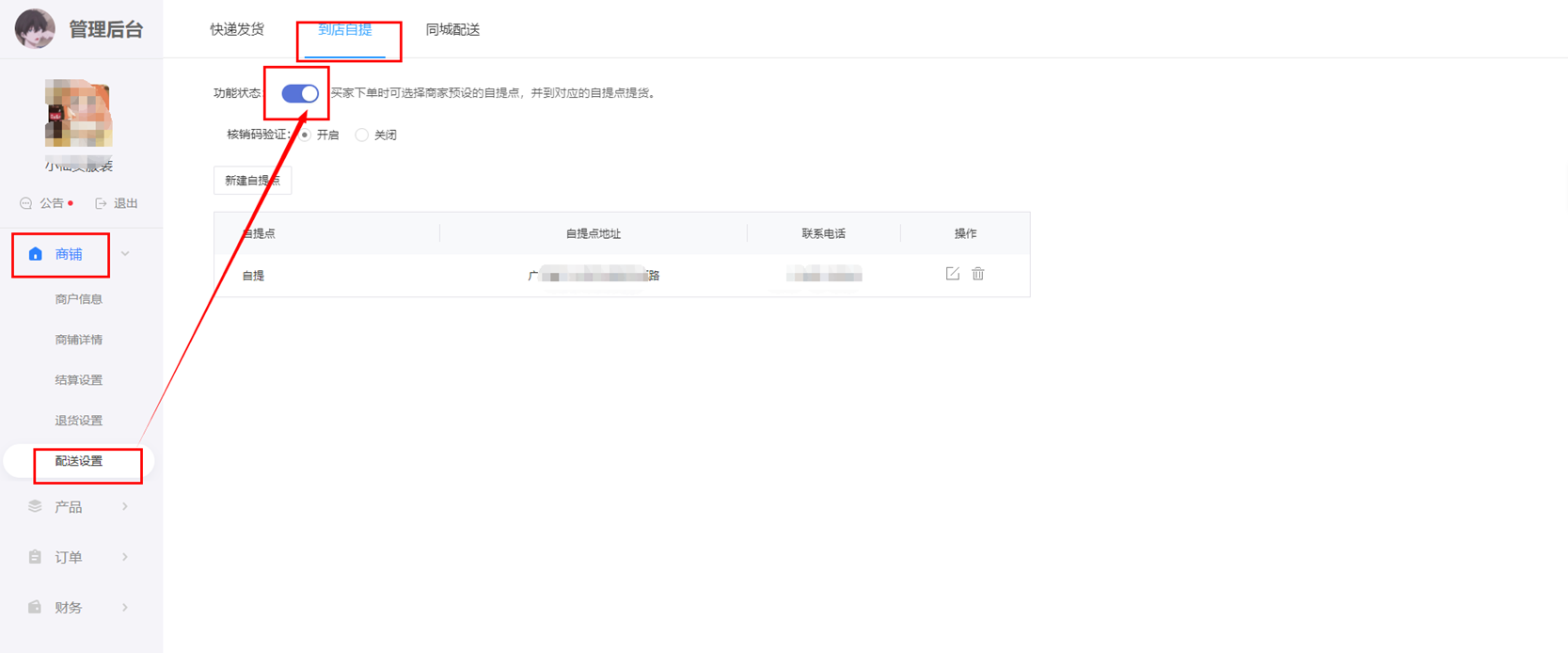 b.如已开启,请在产品管理中确认产品是否有勾选到店自提