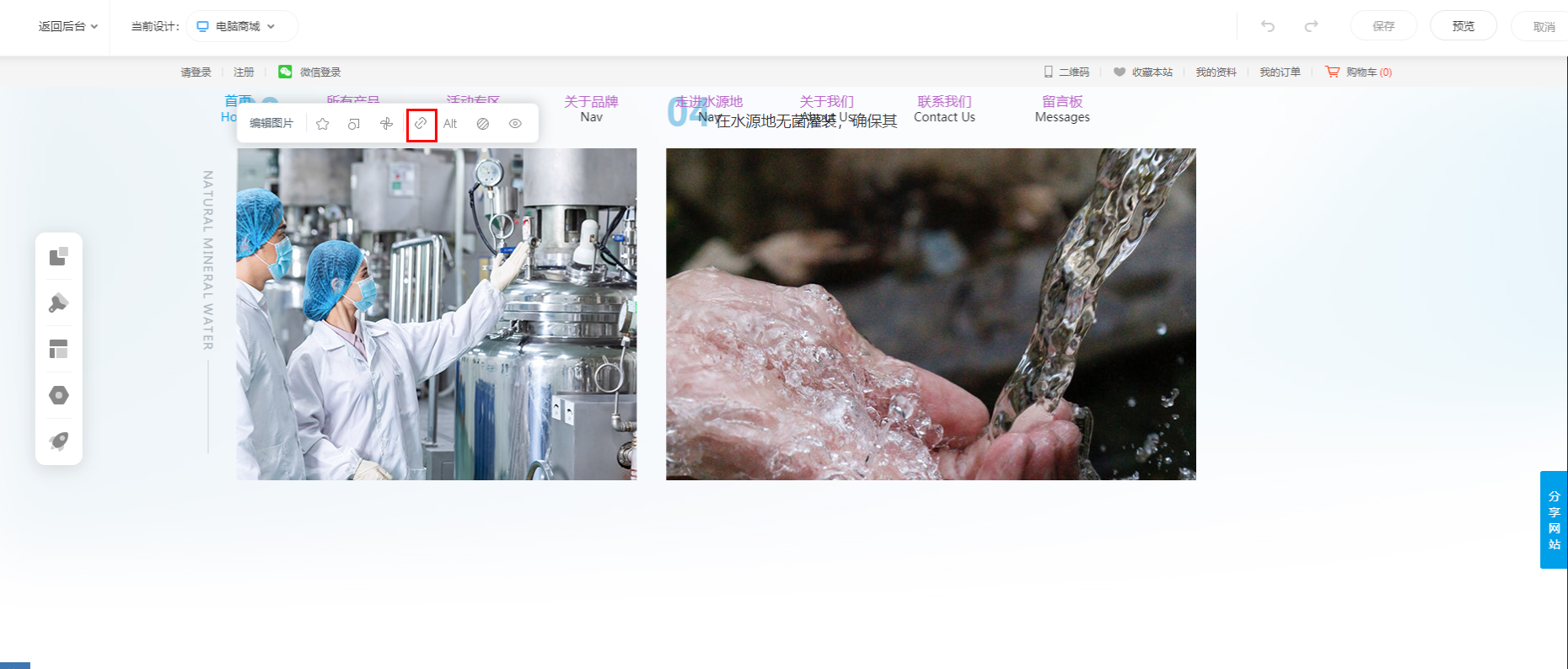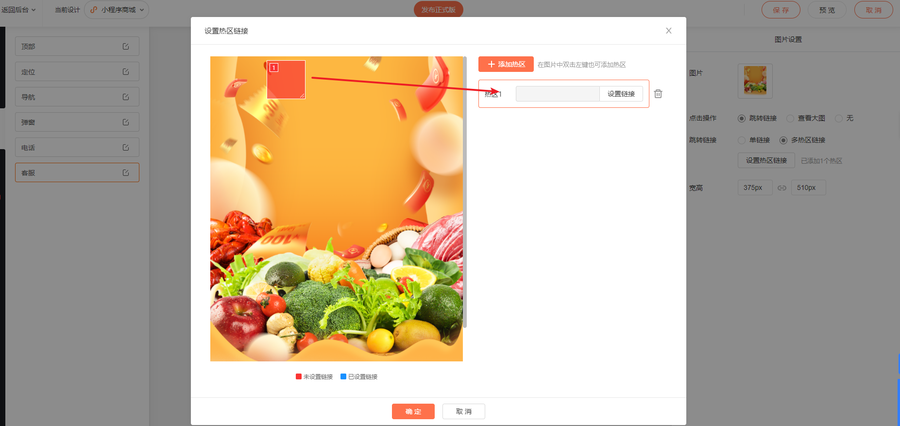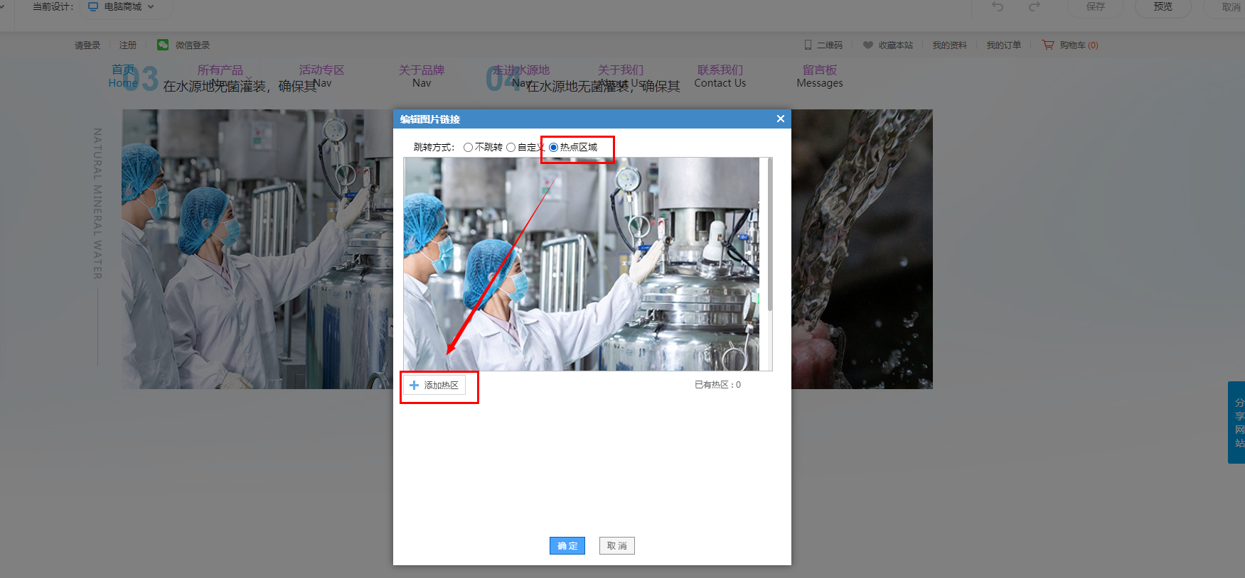 在管理后台的电脑设计界面,鼠标放到模块点击超链接设置,选择热点区域,如下图