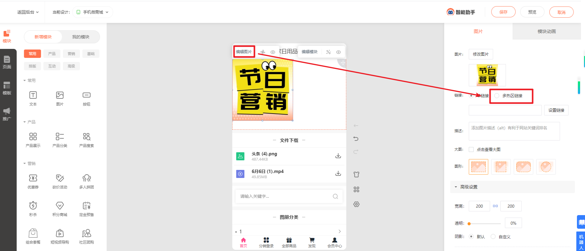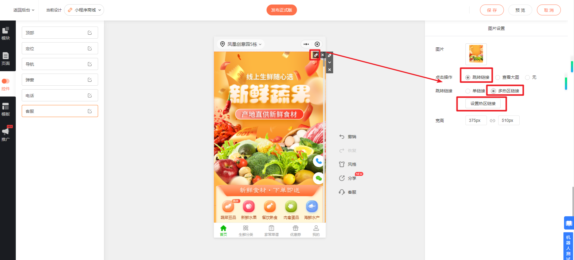 在管理后台的手机设计界面,鼠标放到模块点击设置图片--多热区链接,如下图