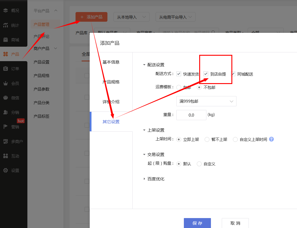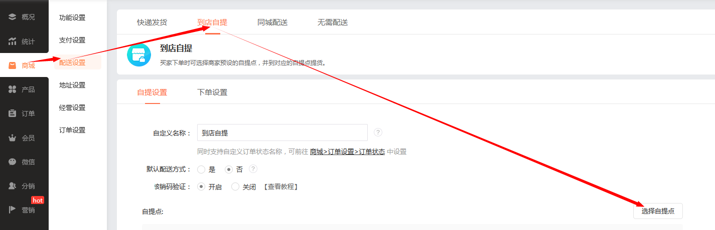 到商城管理后台开启“到店自提”配送方式,并添加自提点,然后新增一个产品设置到店自提配送方式(这个产品用于下单截图,后续接口通过之后可删除这个产品)