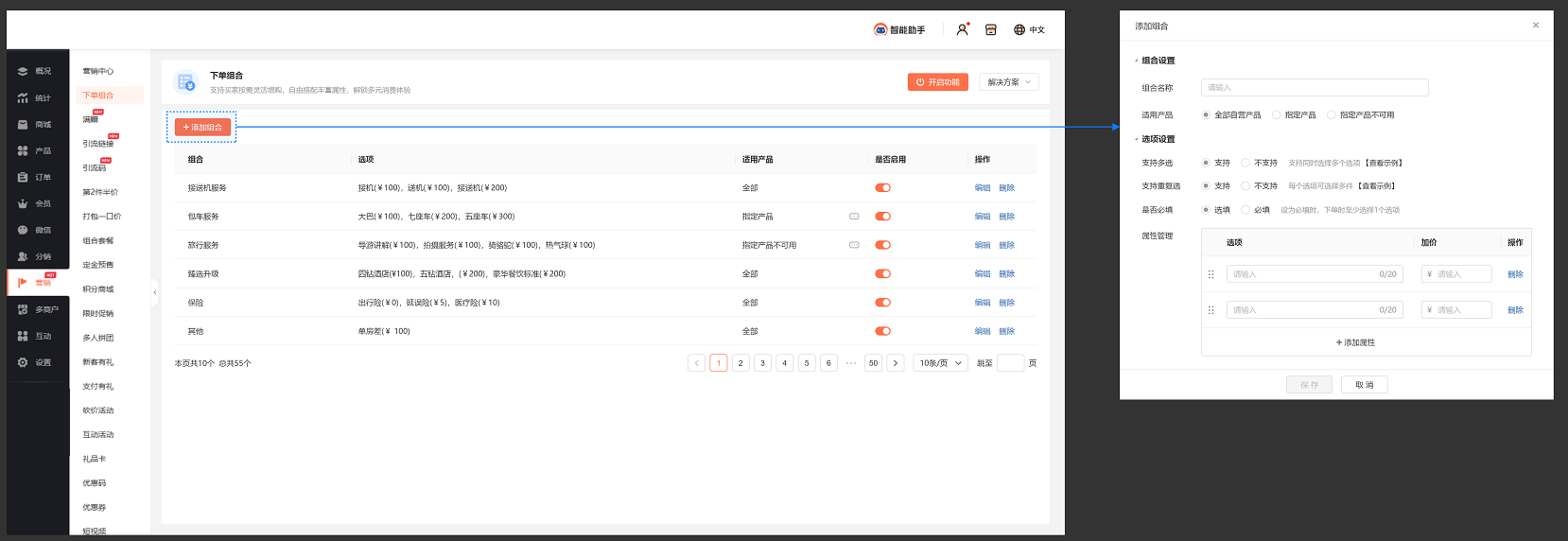 1. 前往商城后台【营销-下单组合】,开启功能后添加下单组合: