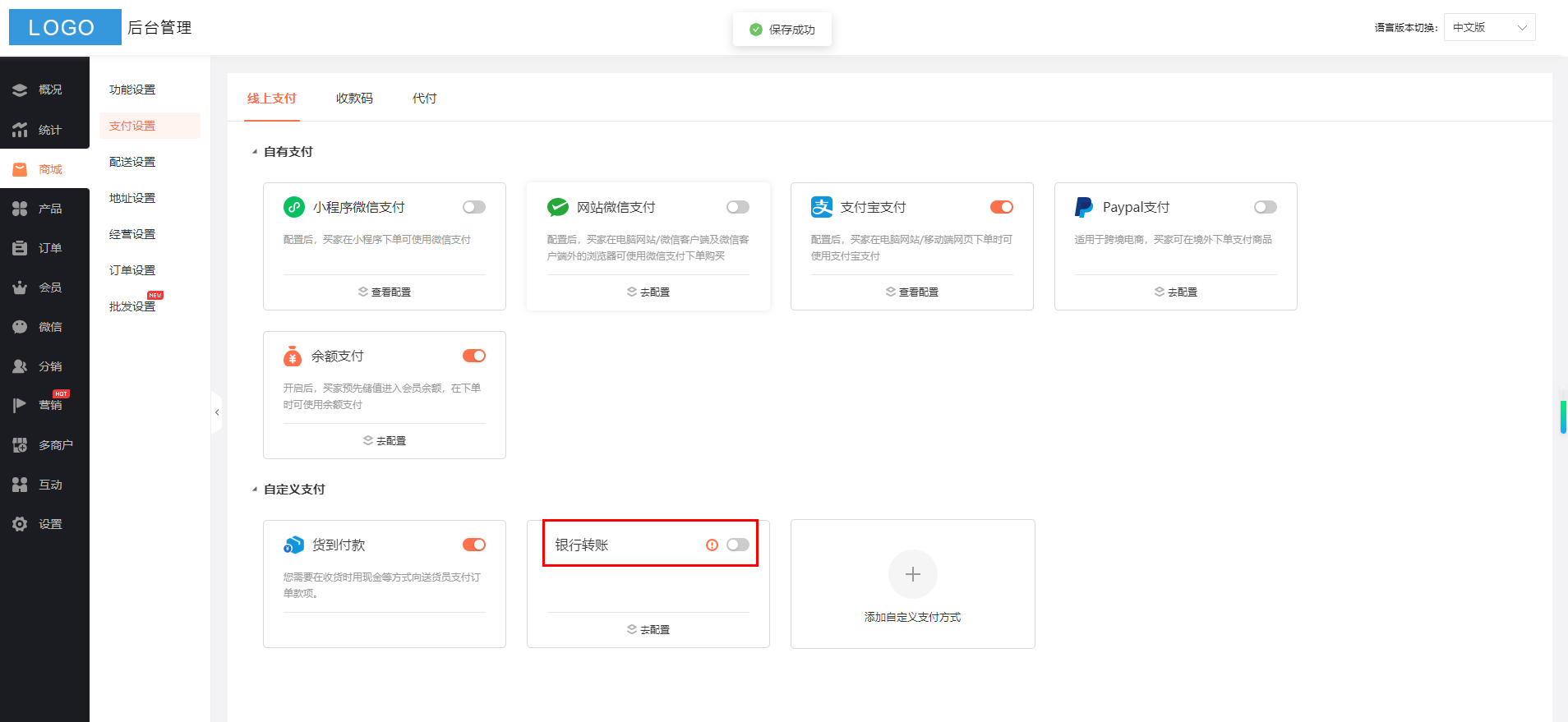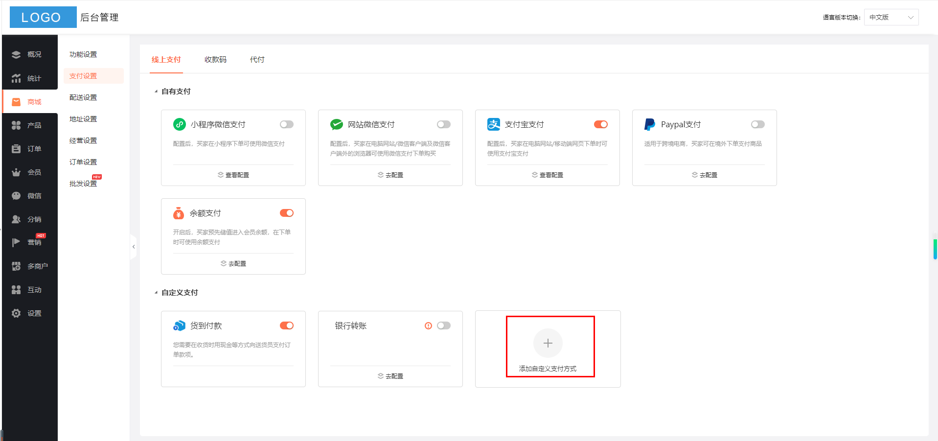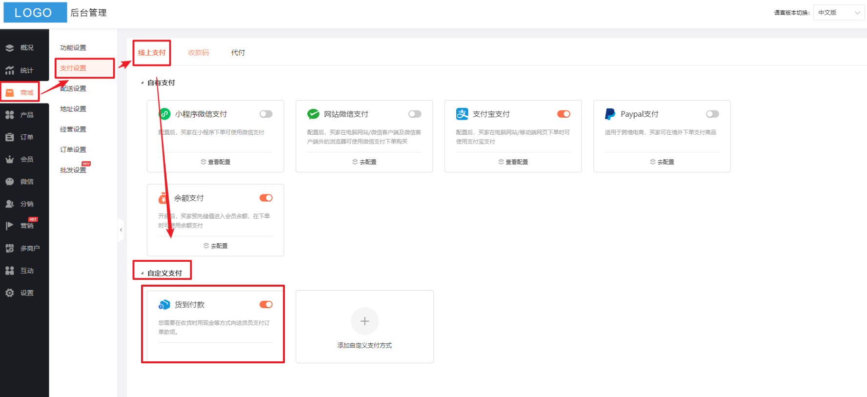 注:子商户订单只适用“货到付款”支付方式,不适用其他自定义支付方式。平台自营的订单适用所有自定义支付方式。