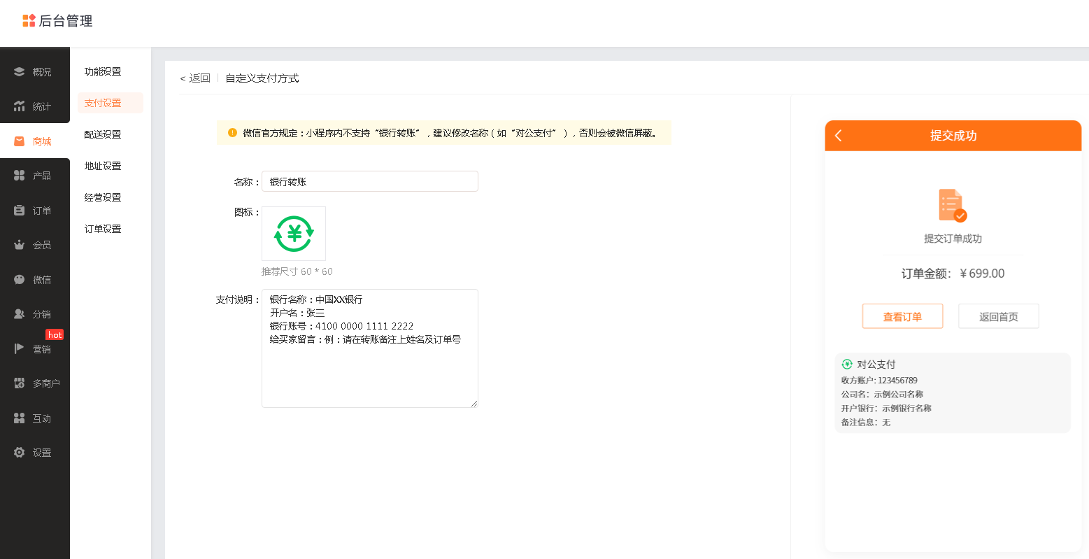 自定义支付 | 微信转账: 收款账号:XXXXXXX 收款人姓名:XXX 注:请在添加备注中填写订单编号 | 在支付说明中添加私人微信号,备注说明订单编号,适用于想借助添加商城粉丝好友,建立会员社群的 |