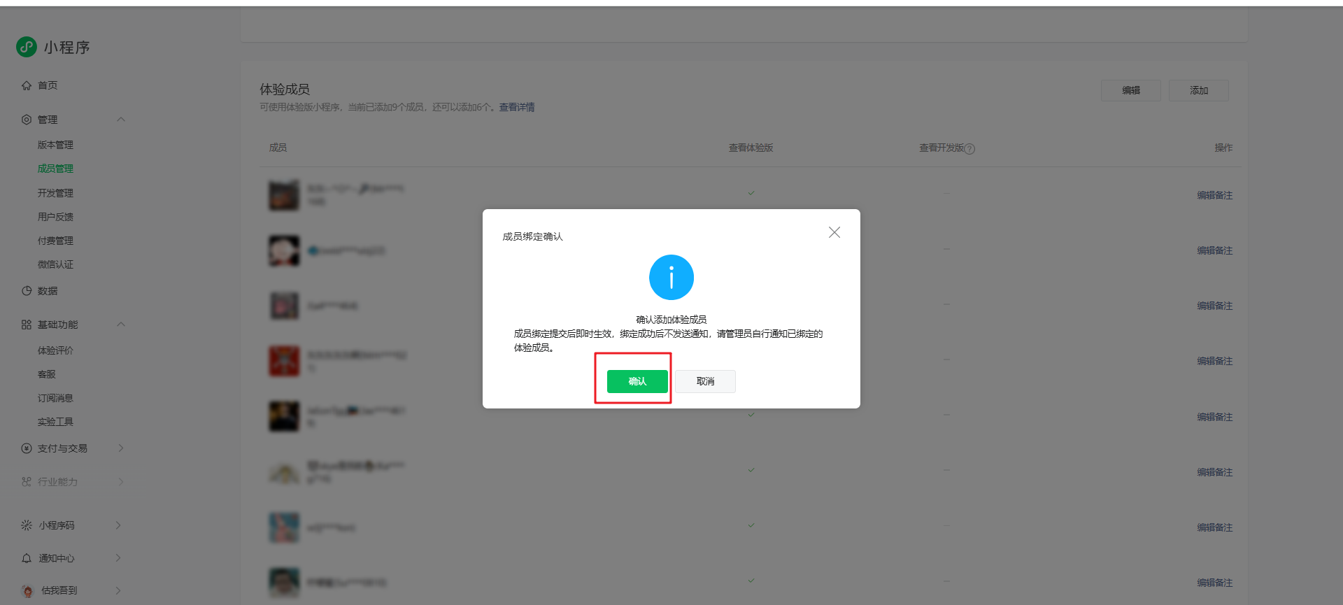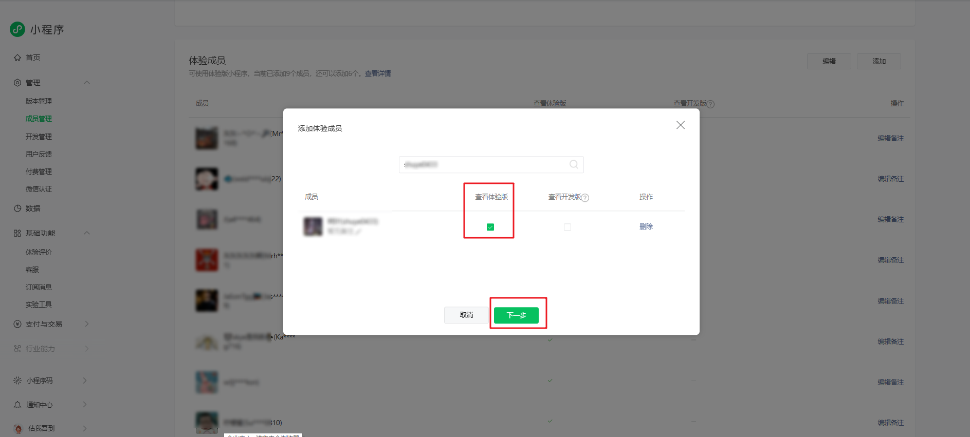 输入该成员的微信号进行搜索,勾选体验权限,点击【下一步】,出现弹窗后点击【确认】提示即完成添加。