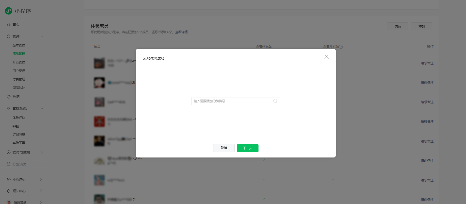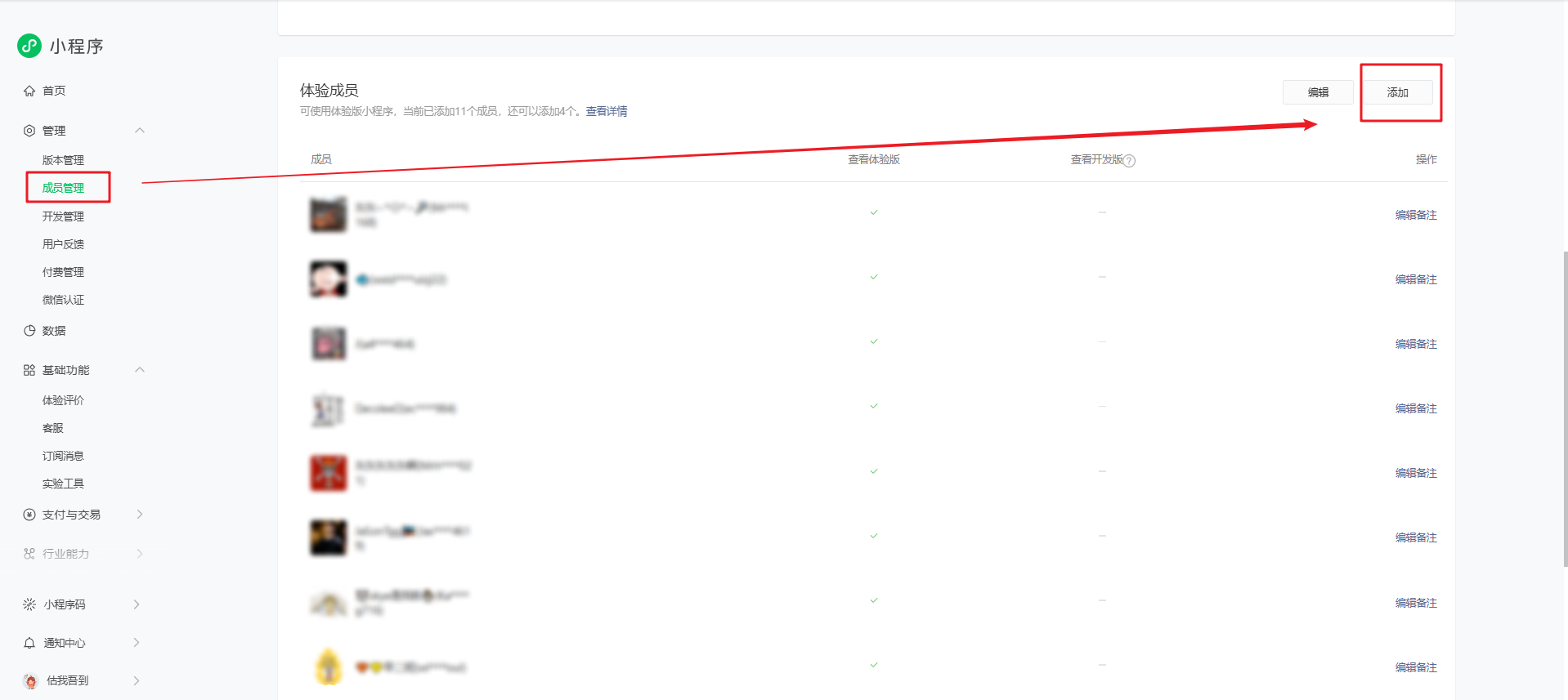 点击微信公众平台登录小程序账号,点击【管理】-【成员管理】,在【体验成员】右侧添加需要体验小程序的成员。