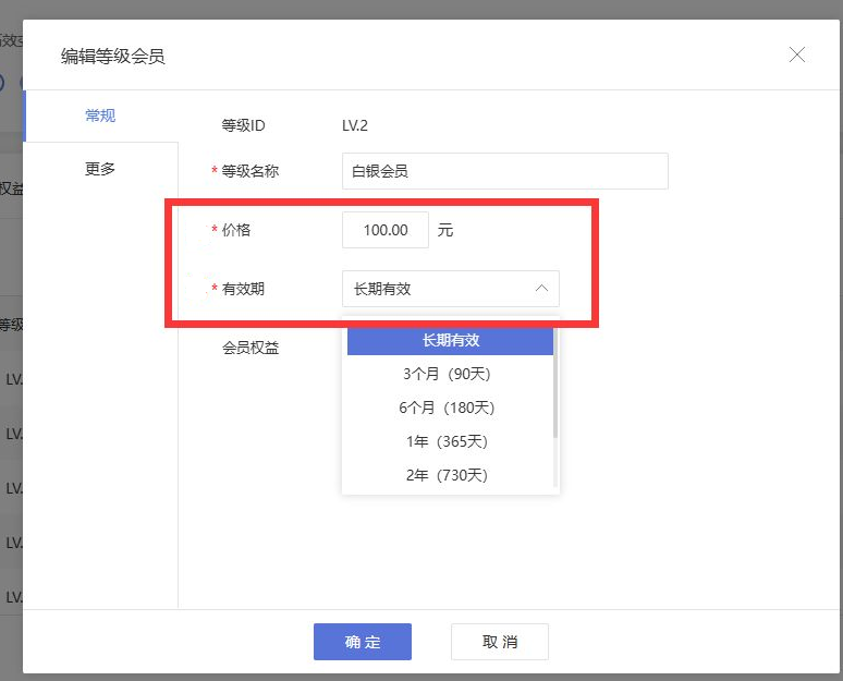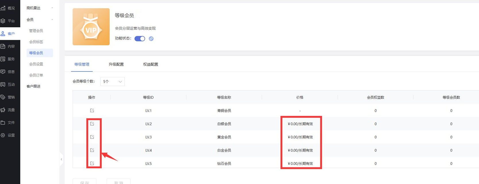 保存后,切换到“等级管理”,设置每个等级的升级费用(LV.1级视为大众会员,不能设置价格)。