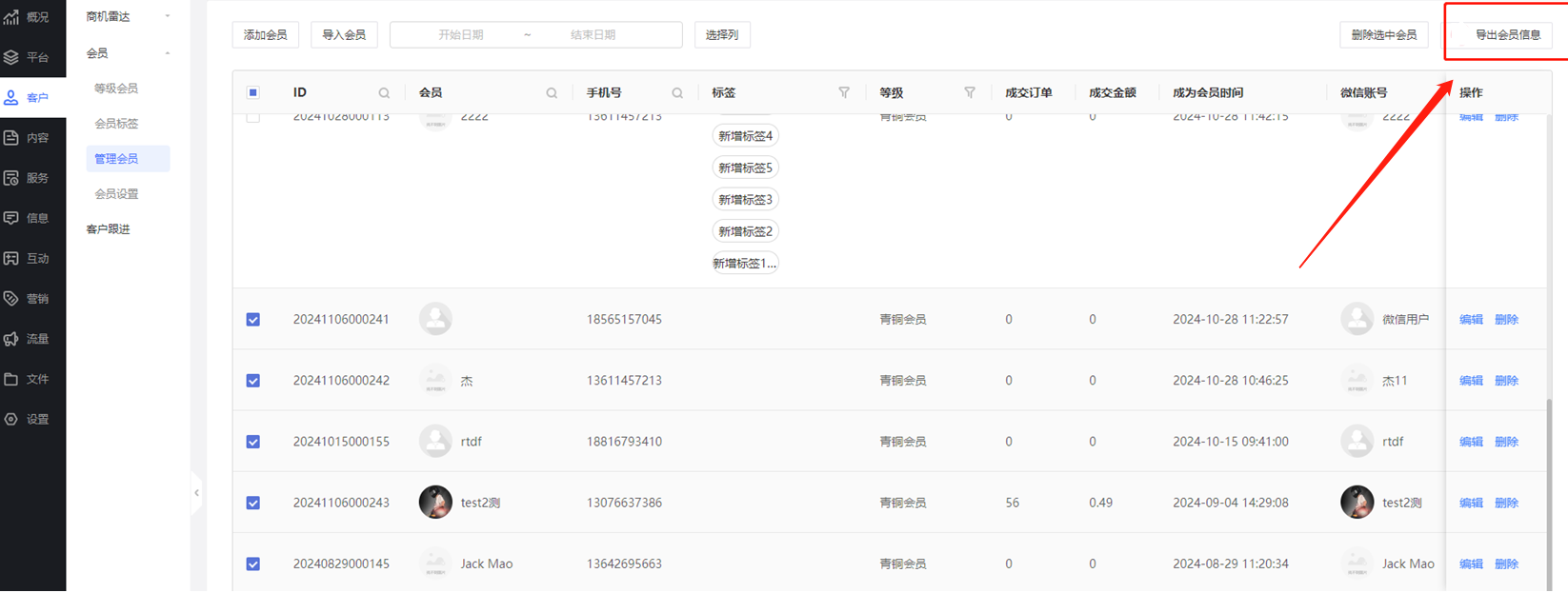 8.1 进入【会员-管理会员】中,可编辑、删除、导出会员。