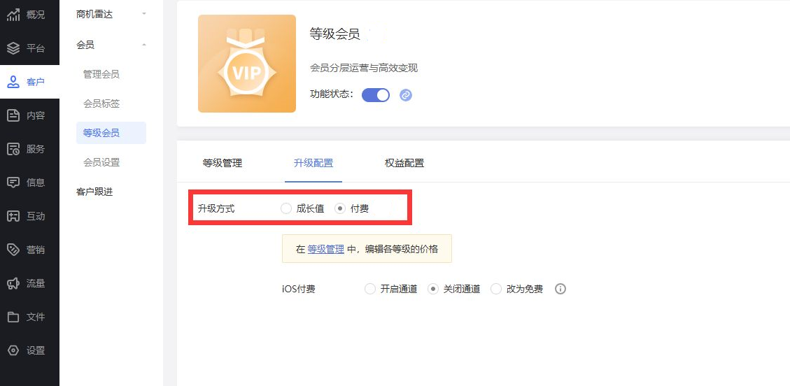 前往“管理后台-客户-会员-等级会员-升级配置”处开启升级方式为“付费”。