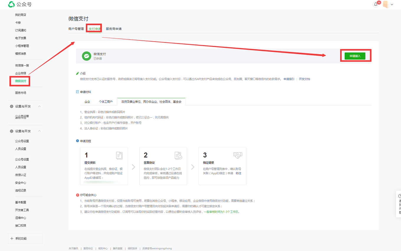 ① 在公众号里点击【微信支付-支付申请】中点击【申请接入】。