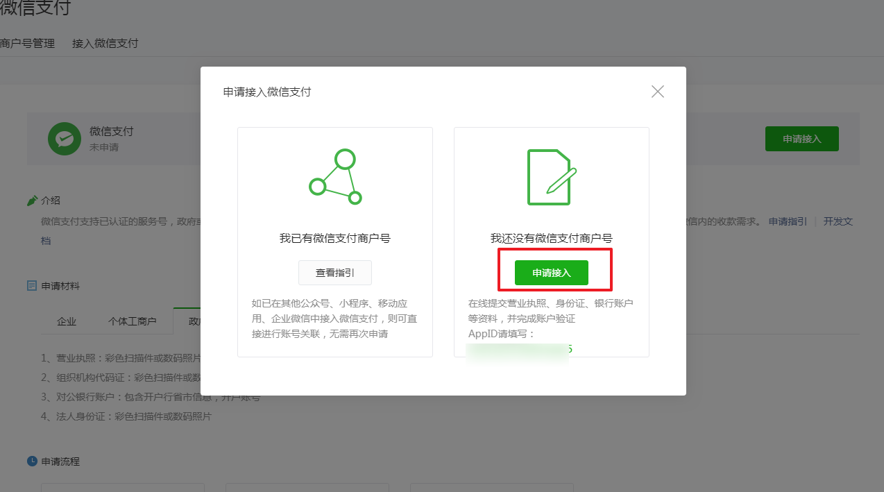 ② 选择【我还没有微信支付商户号】并点击【申请接入】。